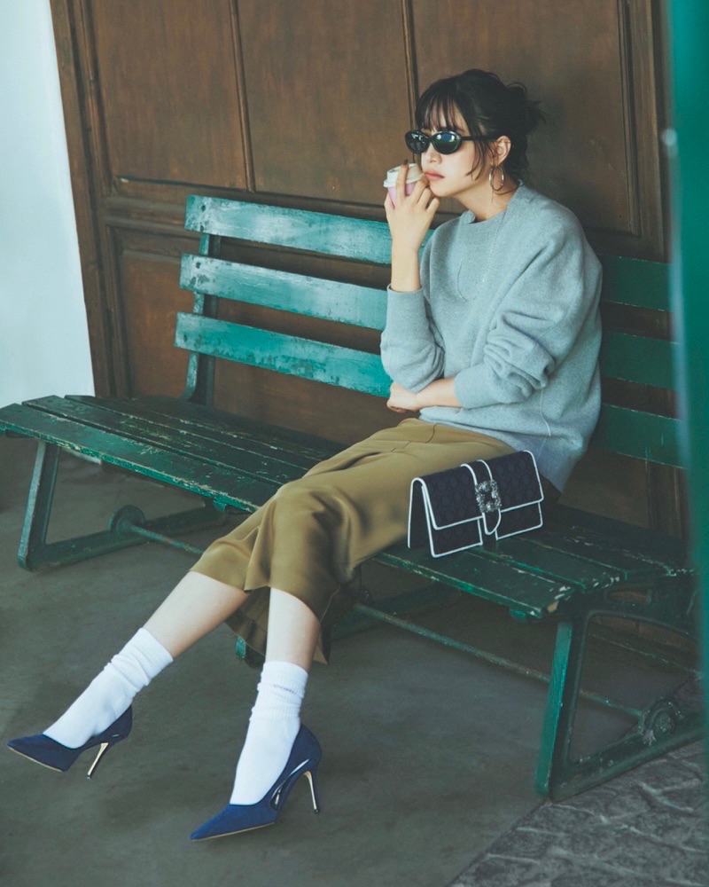 パンプス[H 9㎝]¥156,200 バッグ¥387,200(ともにマノロ ブラニク/ブルーベル・ジャパン)トップス¥22,000(エーケー ワン/デミルクス ビームス 新宿)スカート¥66,000(エストネーション ザ ファースト/エストネーション)ソックス¥2,750(COMMON PARIS/THIRD MAGAZINE)サングラス¥50,600(アイヴァン/アイヴァン 東京ギャラリー)ピアス¥8,800ネックレス¥6,480(ともにアビステ)