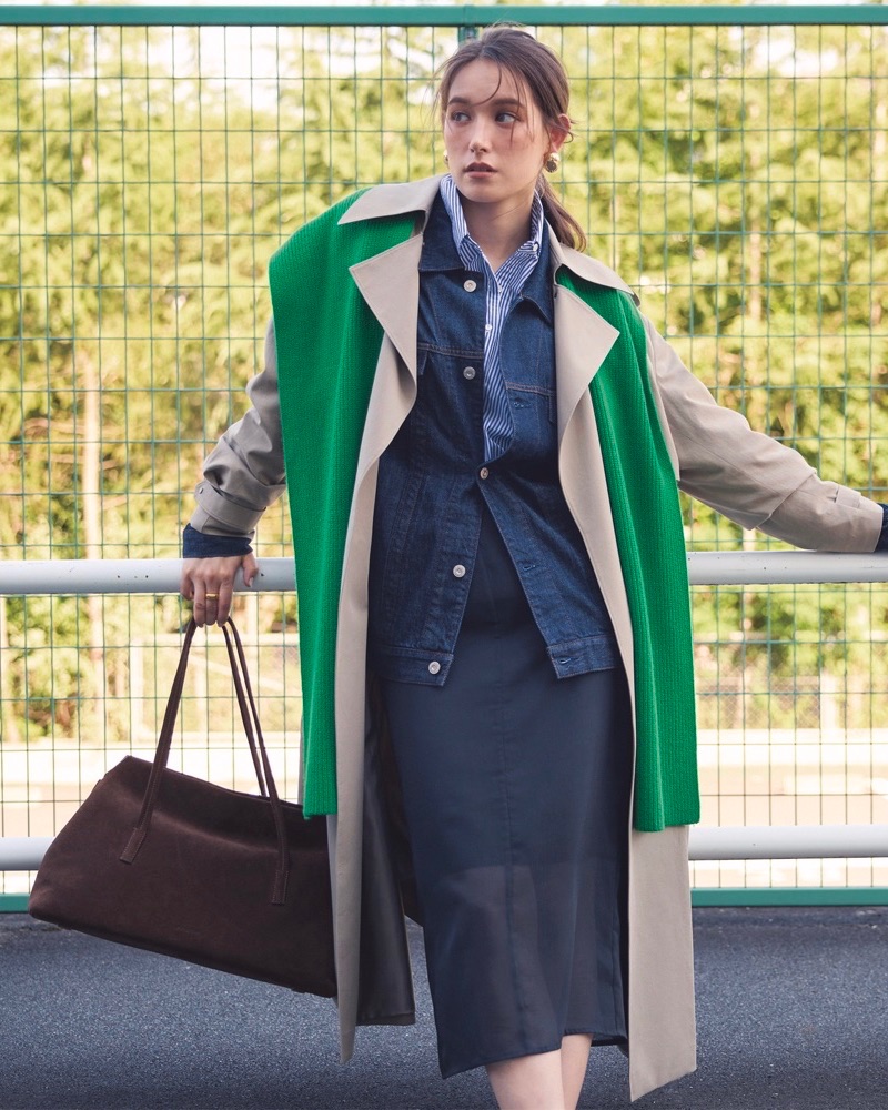 11月25日(火)、デニムジャケットを仕事にも使いたい日は、ブルーストライプシャツとの濃淡レイヤードで奥行きを出して。上からトレンチコートを重ねれば、クラシカルで上品な印象にまとまります。さらに、鮮やかなグリーンのニットストールを差せば、一気に華やかさがプラス。仕上げは、スエードの大きめバッグで柔らかさを添えて。きれいめとカジュアルのいいとこ取りが叶う通勤スタイルです。