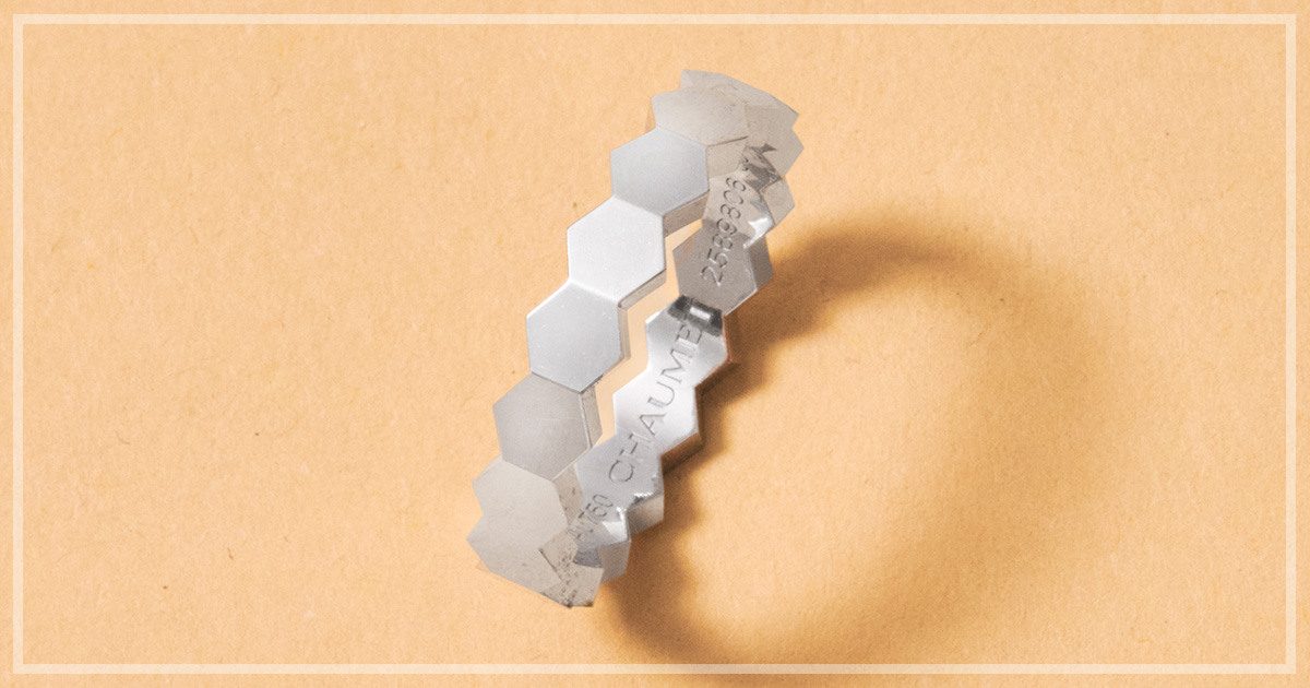 シンプルなのにエッジィな印象を残す「ビー ドゥ ショーメ」のハニカムシェイプに夢中! 愛用中のピンクゴールドに重ね付けしたくて、ちょっぴり太めの4mmサイズのホワイトゴールドを新たに迎えました。