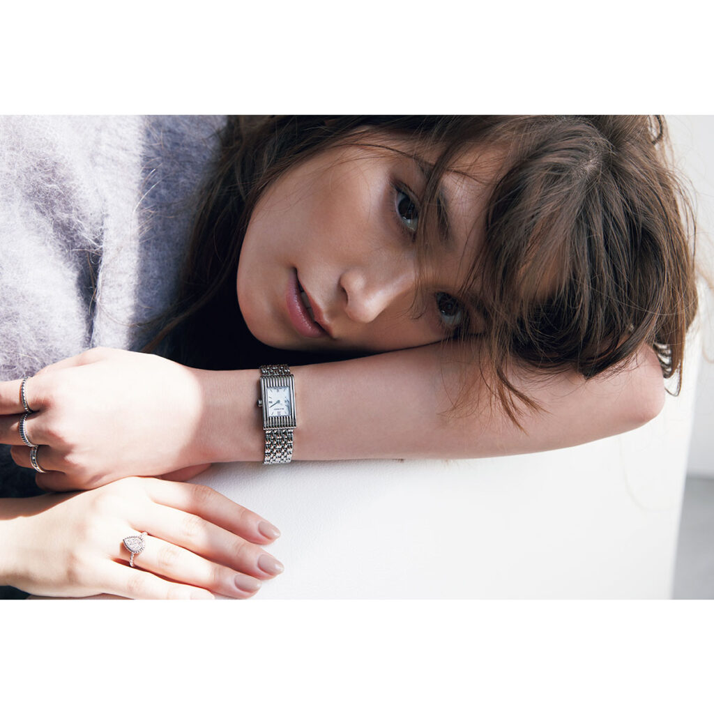 ウォッチ『リフレ ウォッチ スモール』〈SS〉¥583,000リング[右手]¥803,000[左人差し指]¥229,900[左中指]¥292,600[左薬指]¥418,000※すべて予定価格(すべてブシュロン/ブシュロン クライアントサービス)ニット¥46,200(SAYAKA DAVIS/ショールーム セッション)