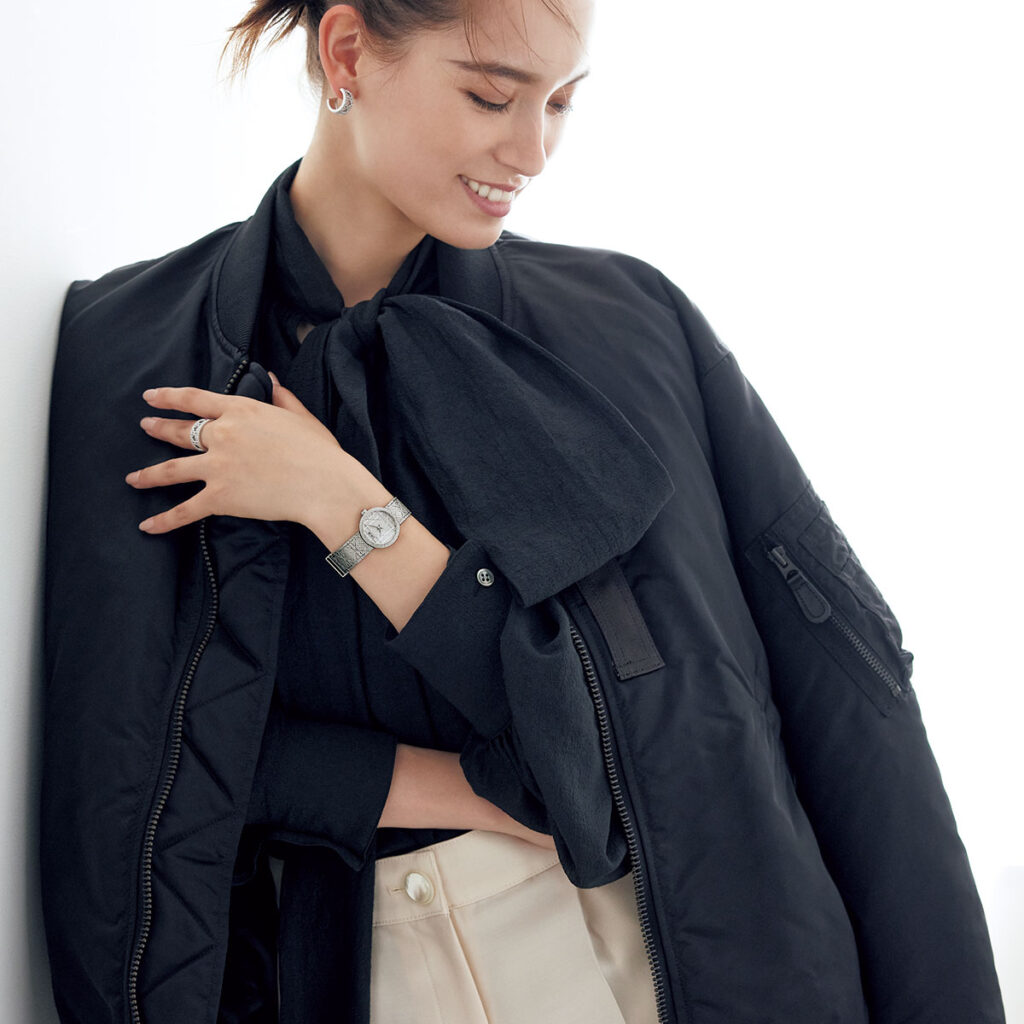 ウォッチ『ラ デ マイ ディオール』〈SS〉¥780,000〈ディオール タイムピーシズ〉イヤリング¥770,000リング¥570,000〈ともにディオール ファイン ジュエリー〉(すべてクリスチャン ディオール)ブルゾン¥88,000(ハイク/ボウルズ)ブラウス¥25,300(ウィム ガゼット/ウィム ガゼット ルミネ新宿店)パンツ¥110,000(エストネーション)