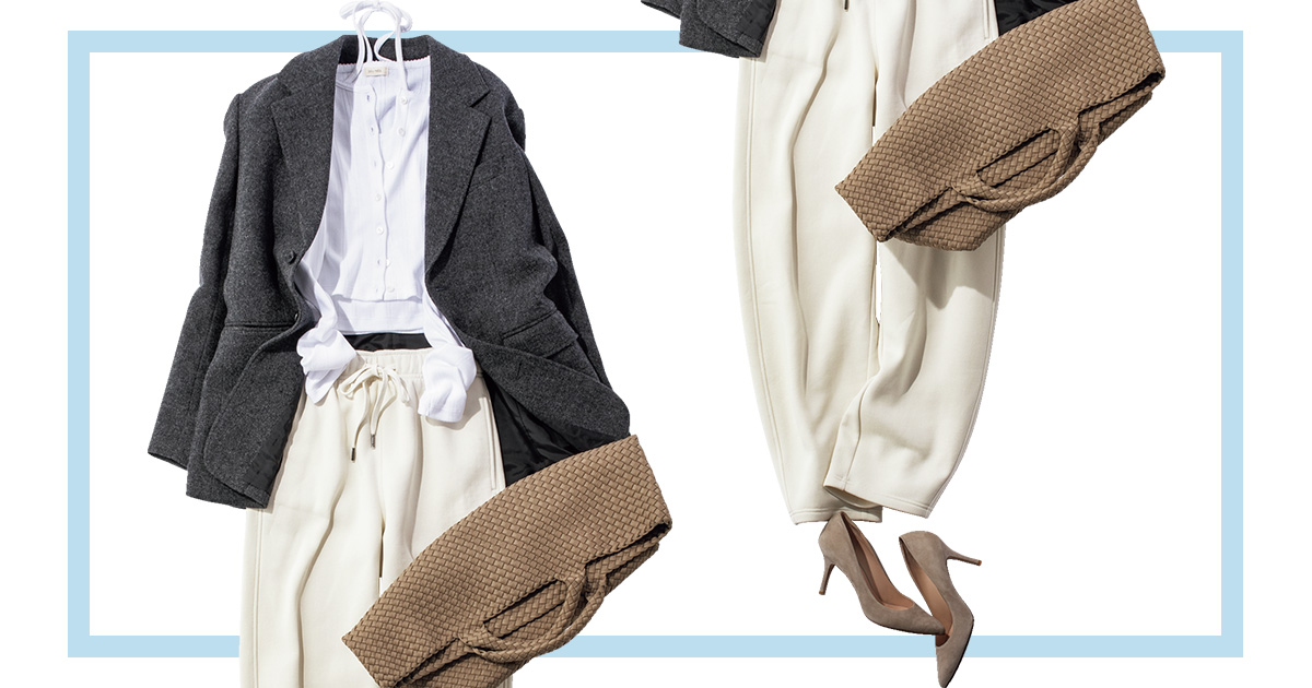 去年大ヒットしたGUのバレルレッグスウェットパンツが今季も登場! 裾に向かって曲線を描くシルエットで、オーバーサイズのジャケットを合わせてもスタイリッシュに。スウェットパンツ¥2,990(GU)ジャケット¥59,400(ザ シンゾーン/シンゾーン ルミネ有楽町店)カーディガン¥20,900中に着たキャミソール¥12,100(ともにデ・プレ)バッグ¥61,600(ナゲディ/ハウント代官山〈ゲストリスト〉)靴¥26,400(銀座かねまつ/銀座かねまつ6丁目本店)