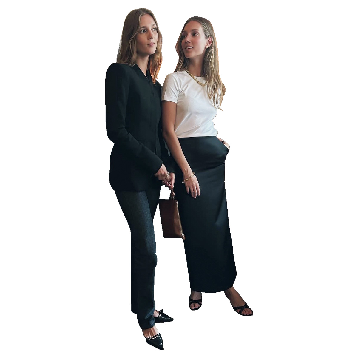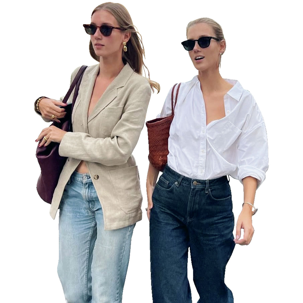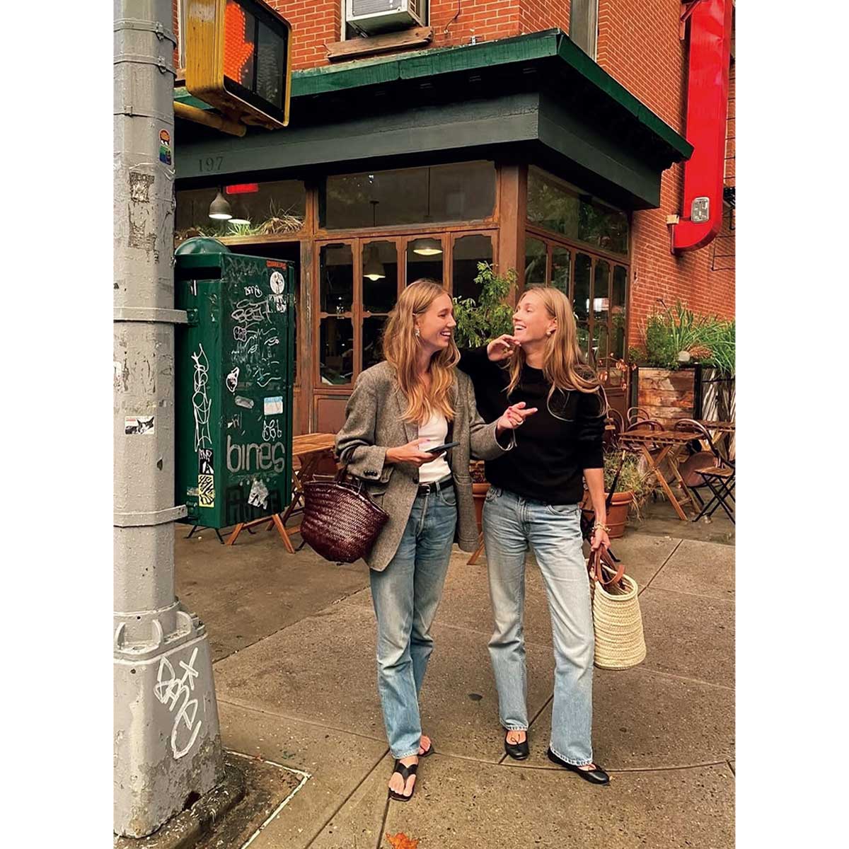 姉妹のアイコンファッションといえば、やっぱりデニムスタイル。脚のラインは拾わずとも、すらりとしたストレートデニムに、ゆったりめのトップスを合わせるのが定番。足元はレザーのぺたんこ靴で、リッチ感をひとさし。