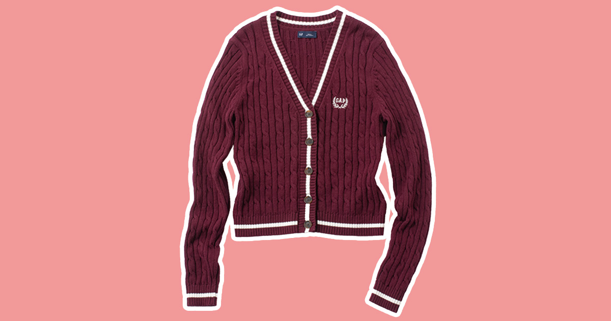 スポーティなラインと、エンブレム刺しゅうがアクセントになった、ミドルゲージのカーディガン。テニスっぽいデザインをゴルフにも取り入れて、たちまちトレンド感アップ。ニットカーディガン¥7,990(Gap)