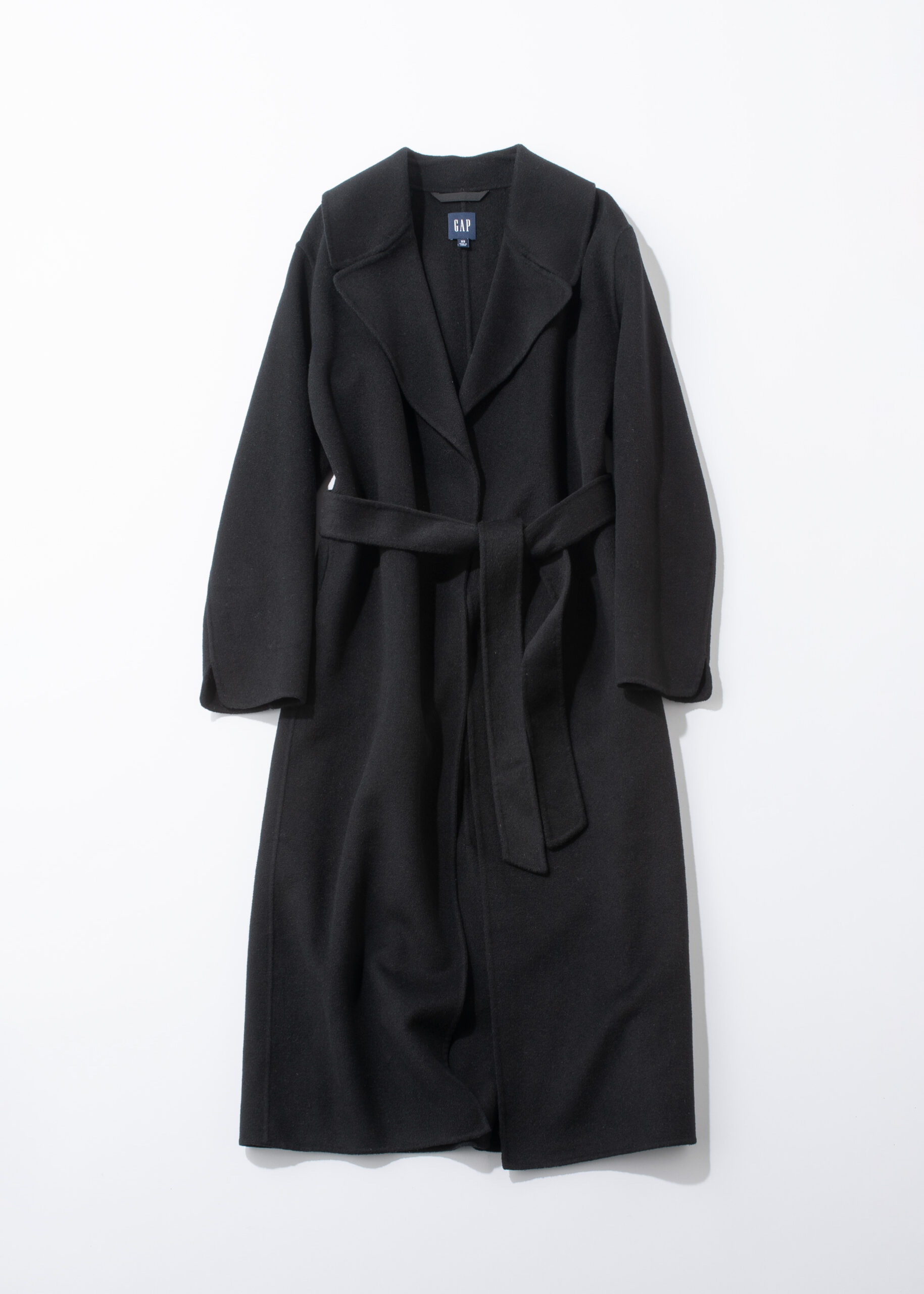 オンライン限定販売のロング丈コート。柔らかくしなやかなウール混素材で品があり、ゆとりのあるサイズ感とストレートシルエットで、どこかハンサムみのある1着。ベルテッドロングコート¥29,900※オンライン限定(Gap)
