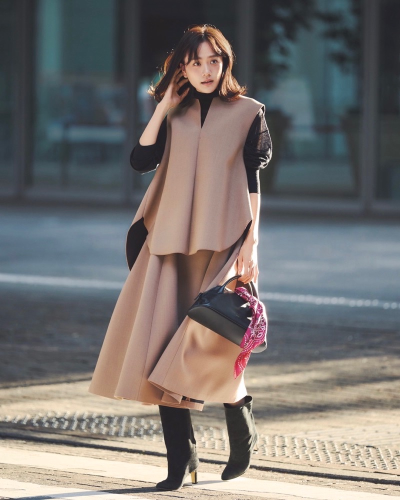 12月4日(木)、立体的なドレープシルエットが美しい、ジレとスカートのセットアップは、もちろん単品でも使えるけれど、合わせて着ると“初対面でも好印象”なムードに。自然と腰位置が高く見えるから、ボリュームのあるデザインでもすっきり見えます。インナーやブーツ、バッグは黒で統一して、装いをキリッと引き締めて。淡いベージュの柔らかさと黒のシャープさが絶妙に重なり、重たく見えない冬の上品ワントーンが完成します。