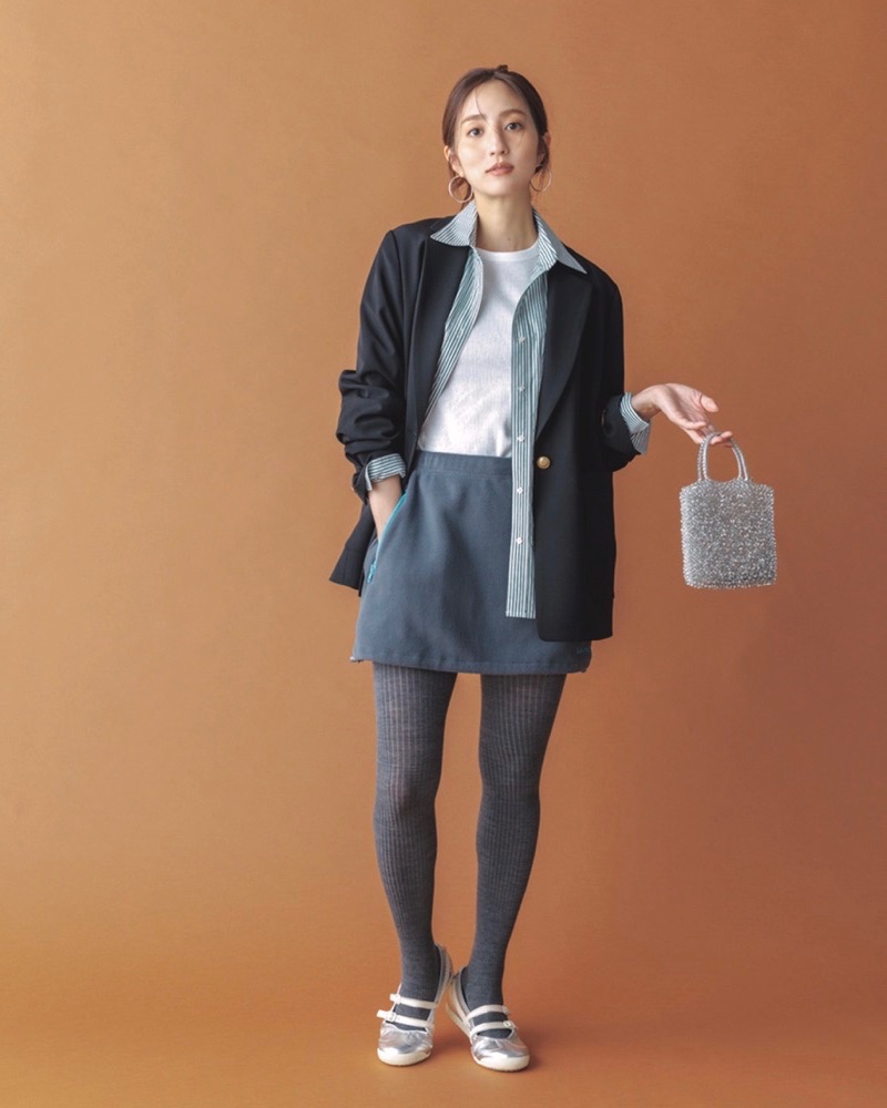 ジャケット¥25,993(ネイビーネイビー)ロンT¥15,400(エイトン/エイトン青山)シャツ¥18,700(アルページュ ストーリー/アルページュ ストーリー プレスルーム)スカート¥26,400(SEA/エスストア)ピアス¥40,700リング¥44,000(ともにマリハ)バッグ¥36,300(アンテプリマ/ワイヤーバッグ/アンテプリマジャパン)タイツ¥5,940(マルコモンド)スニーカー¥17,600(オニツカタイガー/オニツカタイガージャパン)