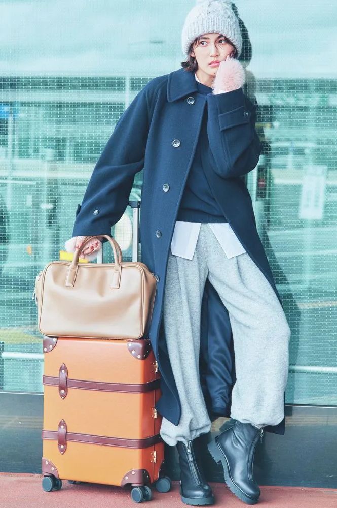 帰省や旅行の移動にもおすすめなスウェットパンツ。ニットの中にシャツを仕込んでよそ行き感を出し、パンツはレザーブーツにインしてエッジをプラス。仕上げに上品なネイビーのロングコートを羽織って、楽ちんで大人なスウェットパンツコーデに。スウェットパンツはエイトン、コートはジャーナル スタンダード、ニットはスローン、シャツはビスチェセット、ニット帽はカシラ、バッグはアダム エ ロペ、靴はオデット エ オディールのもの。