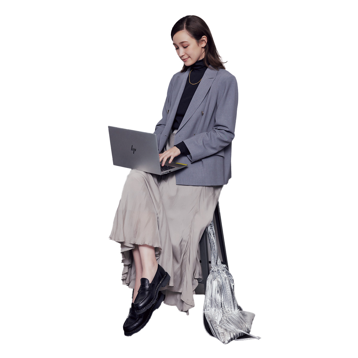 黒タートルにグレージャケットを重ねた王道の通勤スタイルも、柔らかいトーンのスカートを足せば一気に軽やかに。固くなりがちなジャケットコーデに自然な揺れが加わり、仕事の日でも肩の力を抜いたムードに仕上がります。小物を黒でまとめることで、大人らしいメリハリもさりげなく。