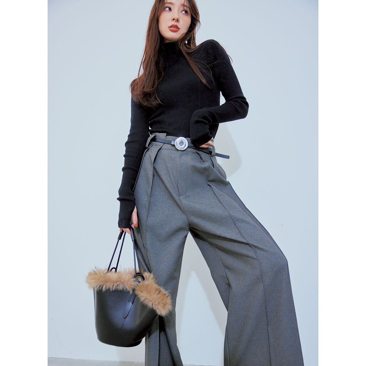黒タートル×グレーパンツの鉄板コンビは、旬の細ベルトを挟むだけでグッと旬な表情にシフト。どちらもベーシックな色合わせだからこそウエストのアクセントが効いて、“シンプルなのにちゃんと洒落てる”装いに導きます。大人のキレイめスタイルを手軽にアップデートしたい日にぴったり。