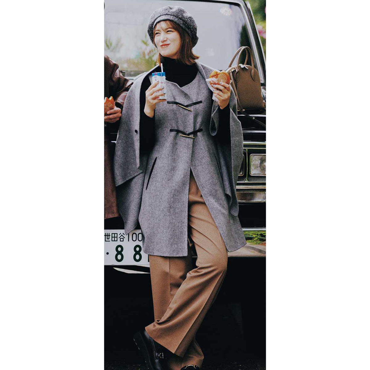 黒タートルにストール&ジレを重ねたレイヤードは、ほどよくクラシカルで冬デートにも好印象。グレーとベージュの落ち着いた色合わせが、どこかやさしい雰囲気を添えてくれます。ベレー帽で顔周りにアクセントが生まれ、写真映えも叶いそう。