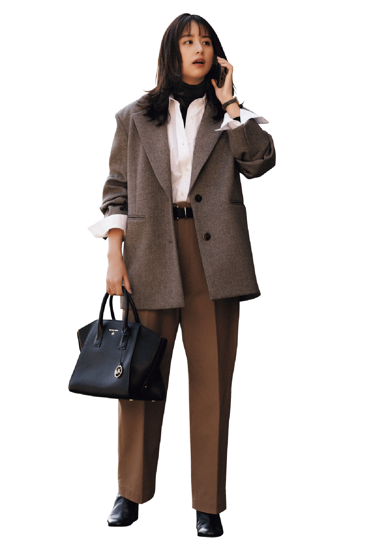 ベーシックなジャケットに白シャツを重ねた王道コーデも、黒タートルを一枚挟むだけでぐっと立体的に。ブラウンパンツのまろやかさが効いて、かしこまりすぎずに着地します。黒小物とリンクさせれば全体がすっきり整い、内勤から外回りまでスマートにこなせそう。