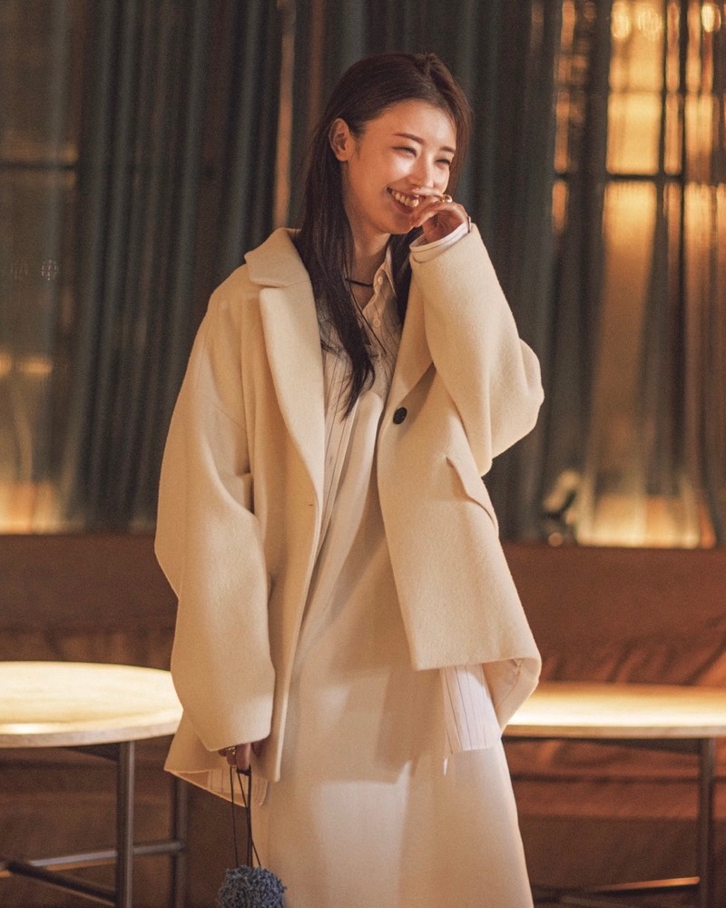 12月8日(月)、白のキャミワンピに重ねたのは、白ベースのストライプシャツ。同系トーンのレイヤードを仕込んだところに、オフホワイトのジャコットをふわりと羽織って“冬の白”を満喫するコーデに。肩が落ちたドロップショルダーが柔らかい丸みを生み、包み込まれるようなシルエットが魅力です。前をラフに開けて着ることで、インナーのレイヤードがしっかり映え、奥行きのあるワントーンスタイルに仕上がります。冬の白を重く見せない、軽やかで品のある着こなしです。