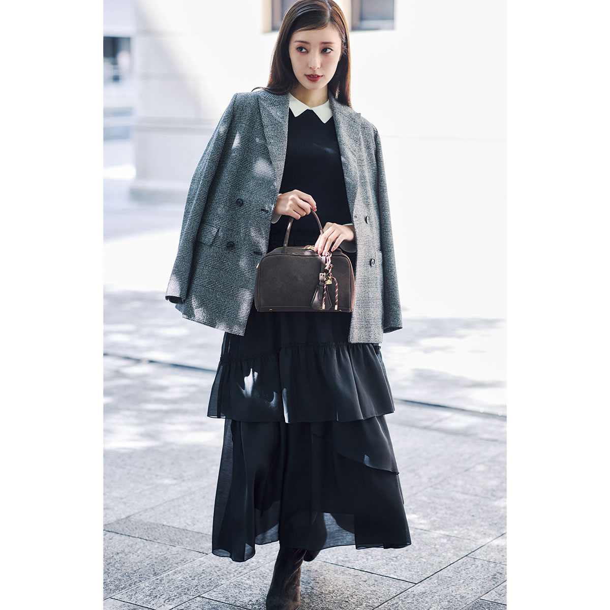 チェック柄が新鮮なダブルジャケットは、ティアードスカートにほどよいハンサムさを添える一枚。甘さを抑えたメリハリで大人の品が引き立ち、新年会の“きちんと見え”にも自然にフィットします。ディテールで魅せつつ配色を落ち着かせれば、上品さと好印象をどちらも狙える装いに。