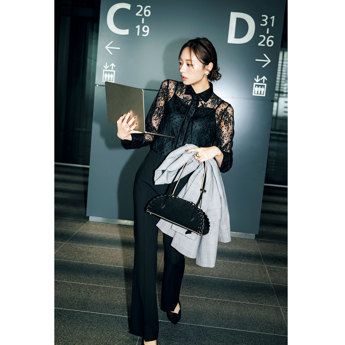 レースブラウスの透け感を味方にすれば、オールブラックでも重くならず華やか。きちんと見えする黒パンツで引き締め、職場の新年会にも通用する大人のドレスアップに仕上げて。ライトグレーのジャケットを添えることで、品のよさと凜としたムードが宿ります。