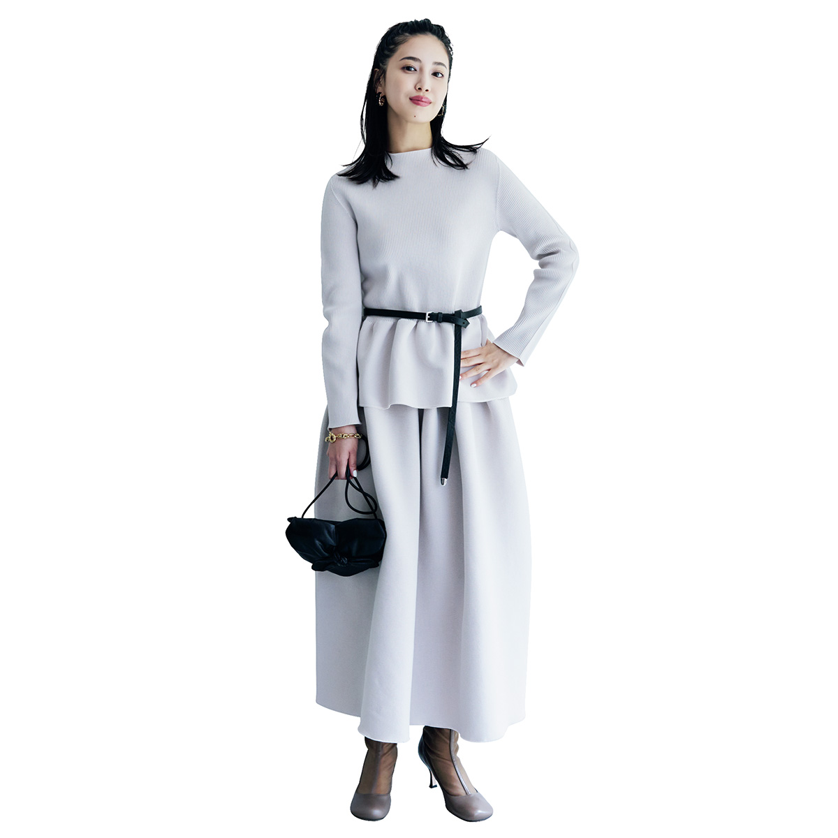 立体的なペプラムトップとスカートの組み合わせは、ワンピのように着映えるのに甘くなりすぎないバランス。細いベルトでウエストを締めるだけで、シルエットにメリハリがついて上品さがぐっと引き上がります。合わせを考えなくても華やぐから、新年会のキレイめシーンにもばっちり。