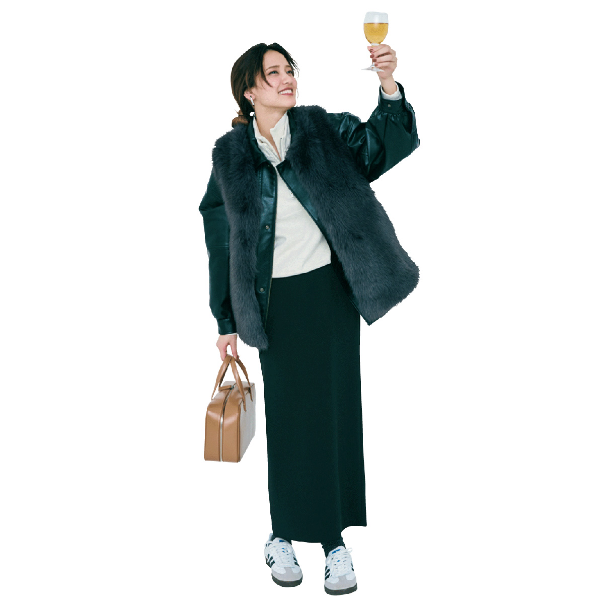 ハーフジップやファージレのボリュームを、タイトスカートの縦ラインで受け止めることで、実は着痩せにもひと役。ほどよくゆるさを残しながら輪郭が整い、カジュアルでも大人っぽく見えるバランスに。足元をスニーカーで軽く仕上げれば、気負わない新年会オシャレを楽しめます。