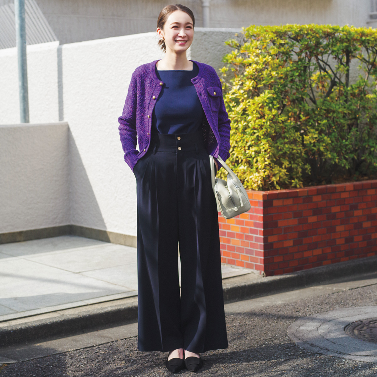 端正なネイビーを軸に、パープルのツイードがほどよい華やぎを添える大人のキレイめスタイル。ワイドパンツの落ち感が全体をシャープにまとめて、派手すぎないのに新年会らしい高揚感も。シンプル派でも挑戦しやすい上品なカラーニュアンスが好印象に導きます。