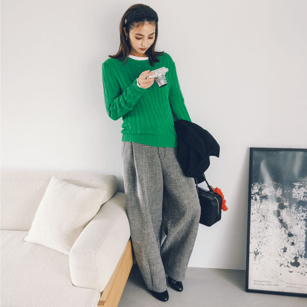 鮮やかなグリーンニットは、気のおけない友人宅での新年会にもほどよく華を添えてくれる主役アイテム。グレーのワイドパンツでトーンを落ち着かせれば、リラックスしながらも大人らしくまとまります。かしこまりすぎず優しげに映る配色だから、久しぶりの再会シーンにもぴったり。