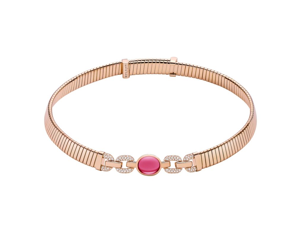 店内に入ると、職人技の結晶ともいえる 彫刻的なトラバーチンの円形カウンター、そしてヴェニーニのムラーノガラスを用いた セルペンティのシャンデリアがお出迎え。夕暮れのローマを思わせるシルク背景のショーケースやナチュラルな大理石の床など、ブルガリらしいタイムレスな美しさが広がります。