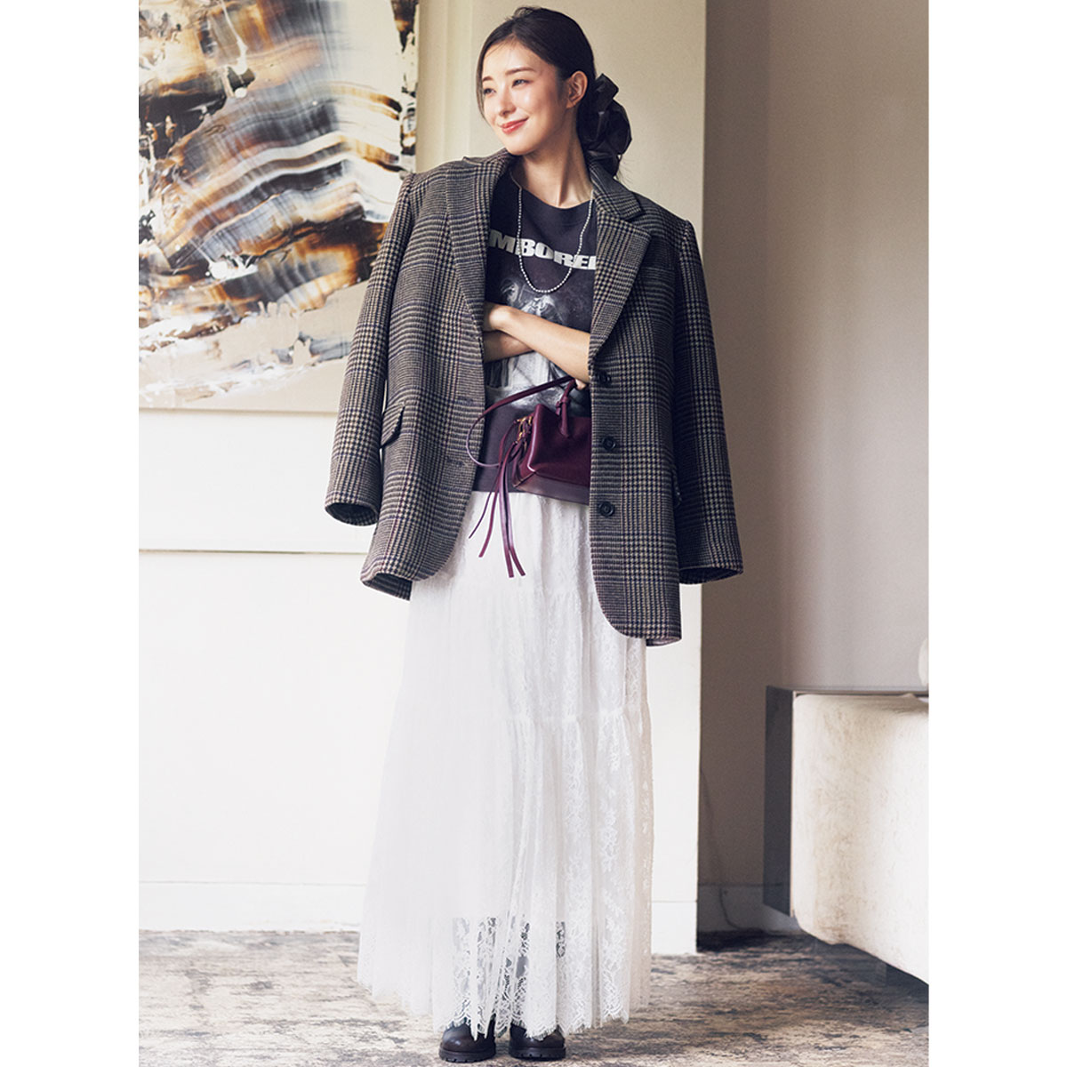 フェミニンなスカートの甘さが際立つ日は、トラッドなジャコットで引き算を。ロゴTのラフさがほどよい遊びになって、装いにこなれ感が生まれます。ショートブーツで足元にメリハリをつけると、レースの表情が際立ち大人の甘辛に。