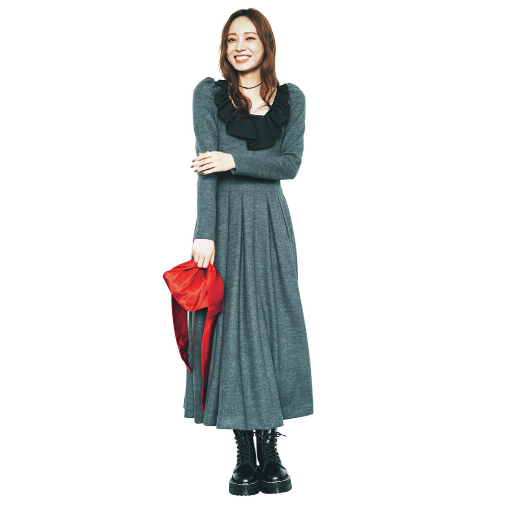 華やかなフリルワンピも、シックなグレーなら大人にちょうどいい洒落感に。赤小物を効かせれば写真映えもばっちりで、女子会の席でも自然と視線を集められそう。足元は黒のレースアップブーツでキリッと引き締めて、かわいさに寄りすぎず“かっこよさ”もひとさじ。