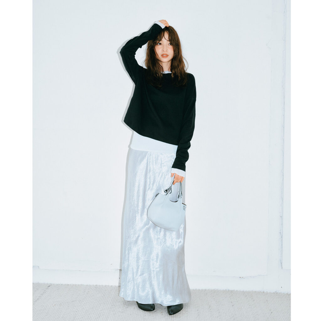 薄手カットソーのレイヤードで立体感を出しつつ、サテンスカートのツヤがすっと際立つ洗練モノトーン。黒トップスのシンプルさに、シルバーの光沢がほんのり華やぎを添えてくれます。小物はグレー~白の淡色でまとめると、クールすぎず女性らしい柔らかさもしっかり確保。