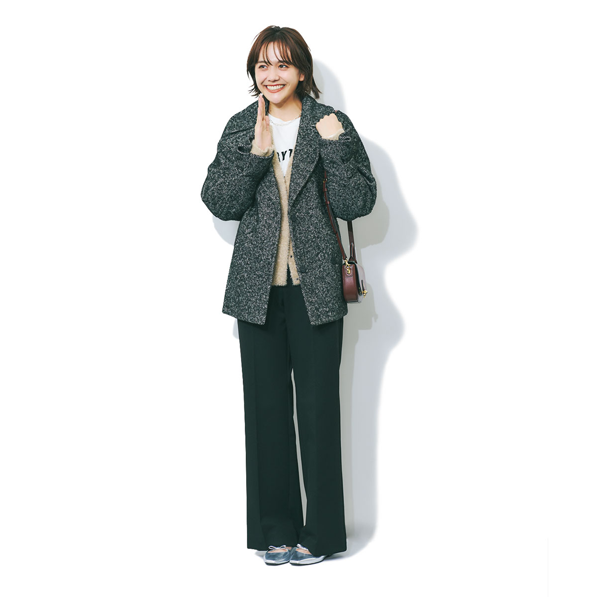 ラメニットカーデのほのかなきらめきが、冬のカジュアルに上品さを添えるスタイリング。ロンTとのレイヤードをツイードコートがまとめてくれ、黒パンツでも単調になりません。足元はシルバーシューズで抜けをつくると、頑張りすぎない“ちょうどいい上品さ”に着地。