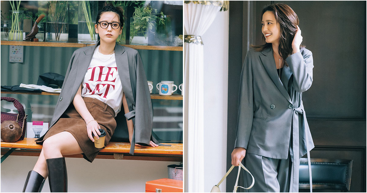 幼く見えがちなロゴT×ミニスカも品格ジャケットの投入で洗練度UP!