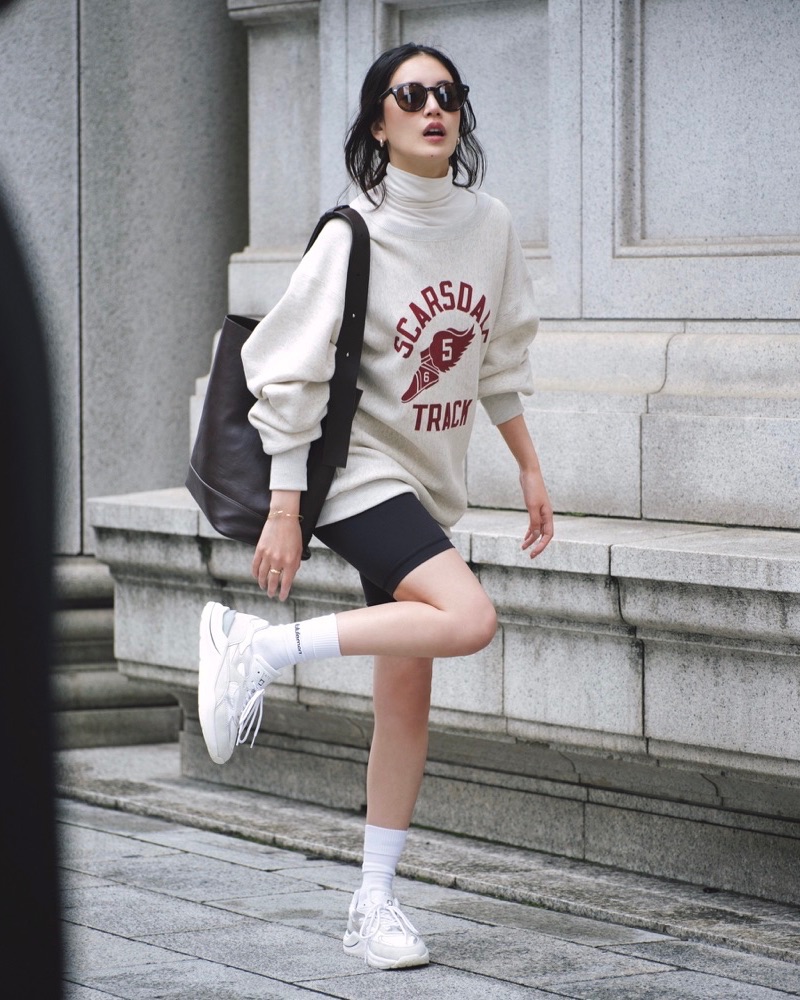 12月21日(日)、カジュアルになりがちなオーバーサイズのスウェットも、組み合わせ次第でぐっとセレブっぽい雰囲気に。上がゆるっとしている分、下はピタッとしたハーフレギンスでメリハリをつけ、足元はボリュームスニーカーでバランス良く。大きめのレザーバッグで程よくきちんと感を添えれば、ラフすぎない大人の休日スタイルに。仕上げにサングラスをプラスして、カジュアル以上の“都会的なスポーティー”が完成です。