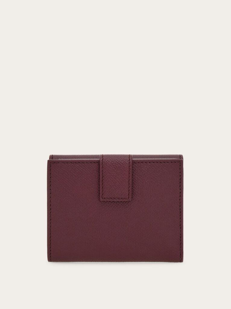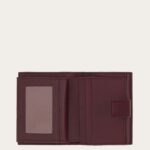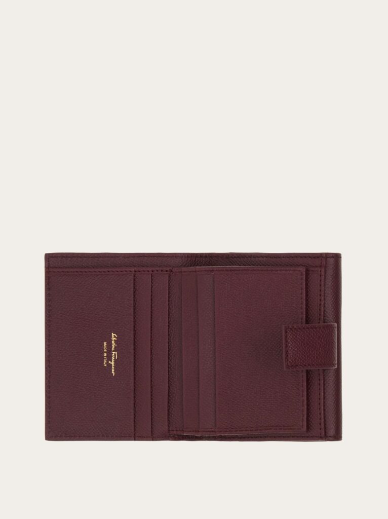 深いプラムカラーが手元に洗練を添える二つ折りタイプ。コンパクトながら必要な収納をしっかり備え、デイリーに活躍します。