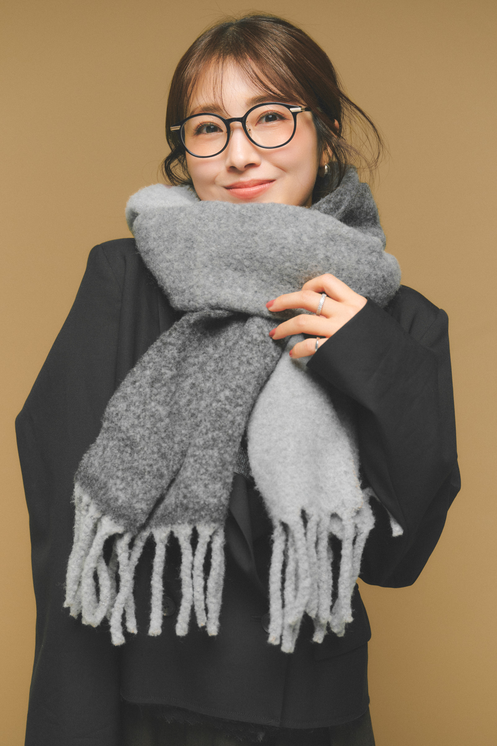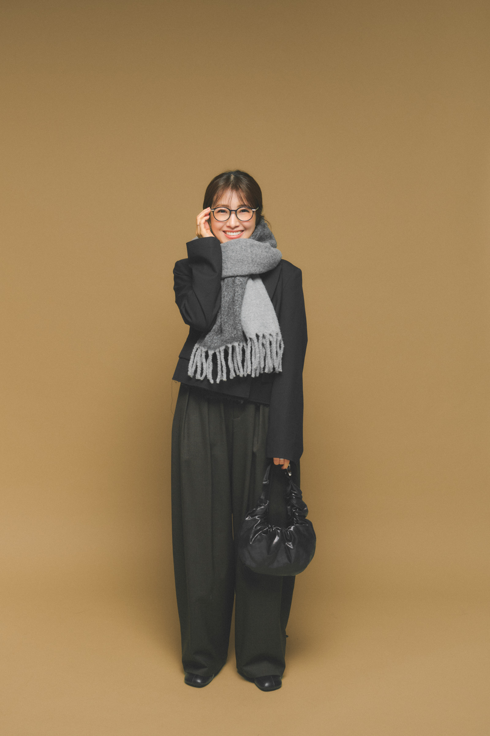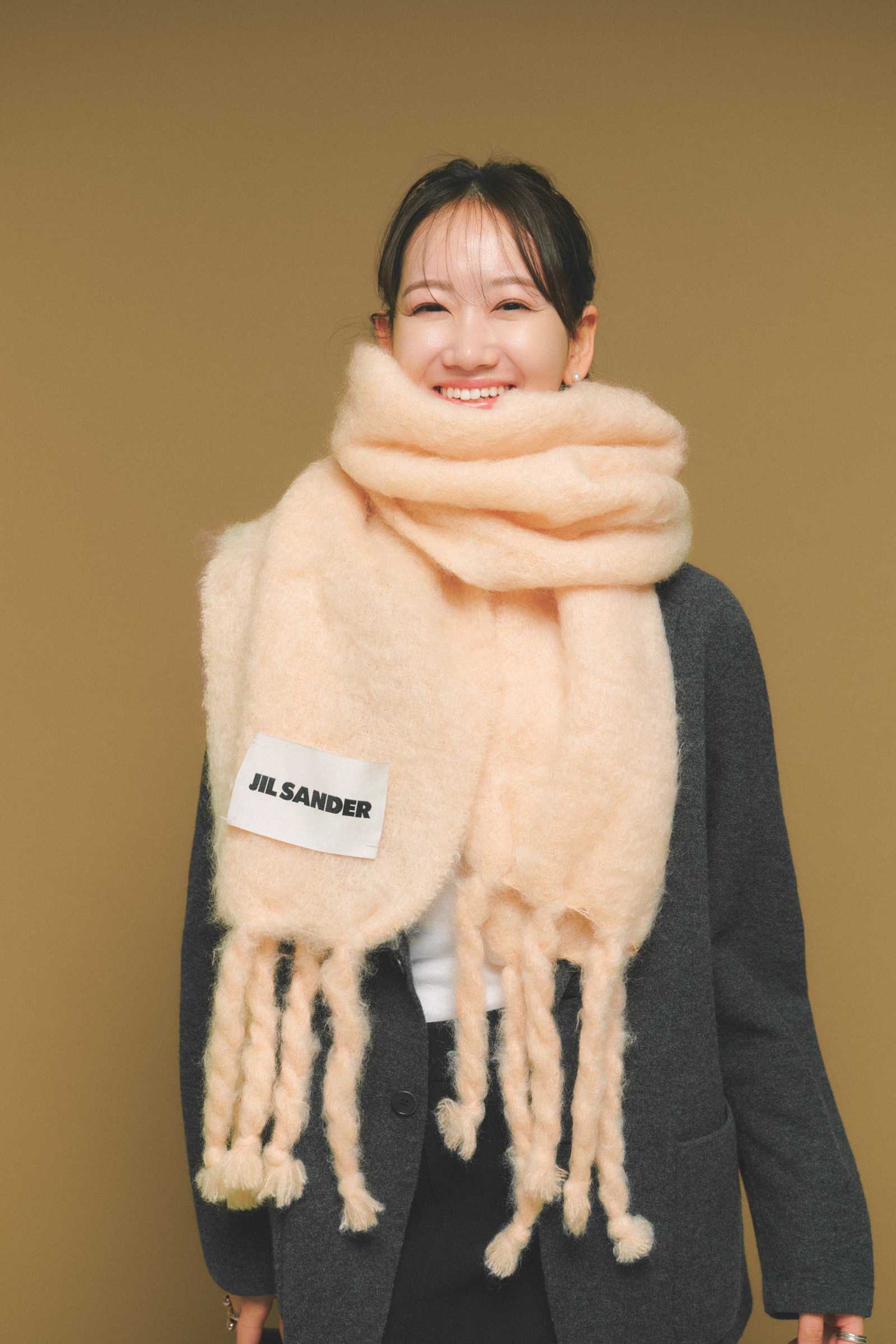 「ジル サンダーのマフラーは、昨年購入。ベージュに近い優しいピンクなので、甘くなりすぎず、ベーシックなコーデにも馴染みます。しっかりボリュームがあり、暖かさはもちろん、巻くだけで小顔に見えるところもお気に入り」