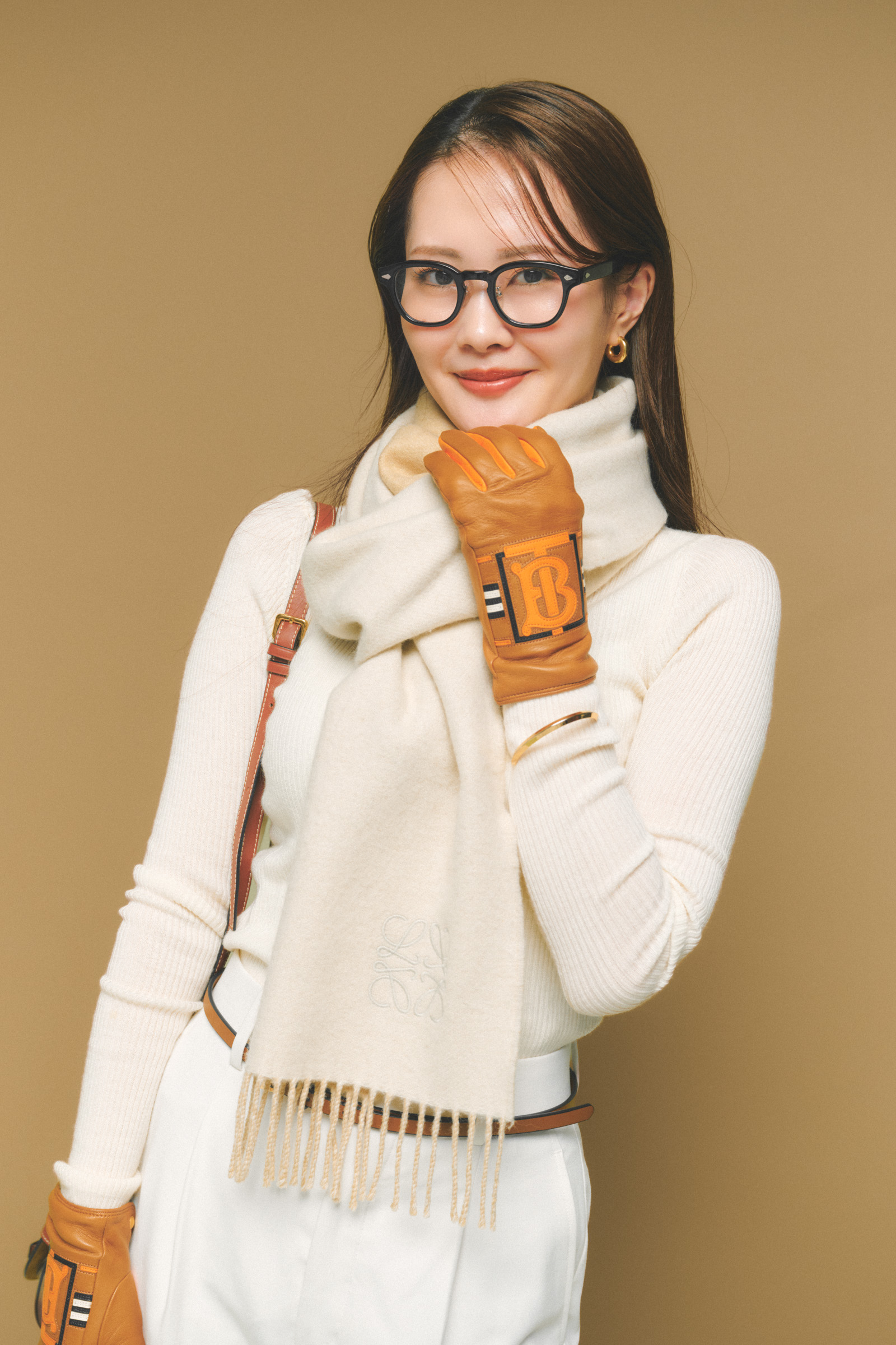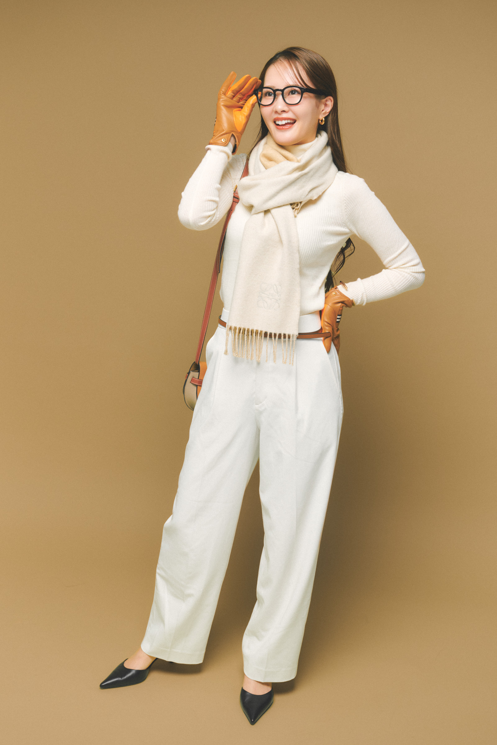 「オールホワイトのコーデに、小物はブラウンでまとめて全体はシンプルにしました。手袋がアクセントになるので服はできるだけベーシックに。きちんと感があって仕事にも行けるコーデです」