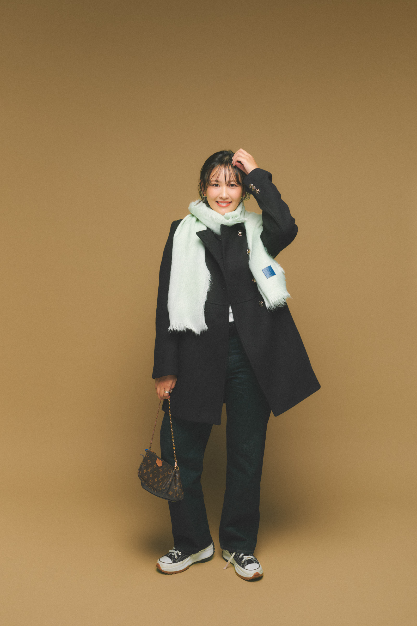 「顔まわりにミントカラーがあることで少し甘くなるので、全体はカジュアルにしました。デニムやコンバースでラフにした分、ジャケットやルイ・ヴィトンのバッグできちんと感はキープ。カジュアルとキレイめのバランスを取るようにしています」