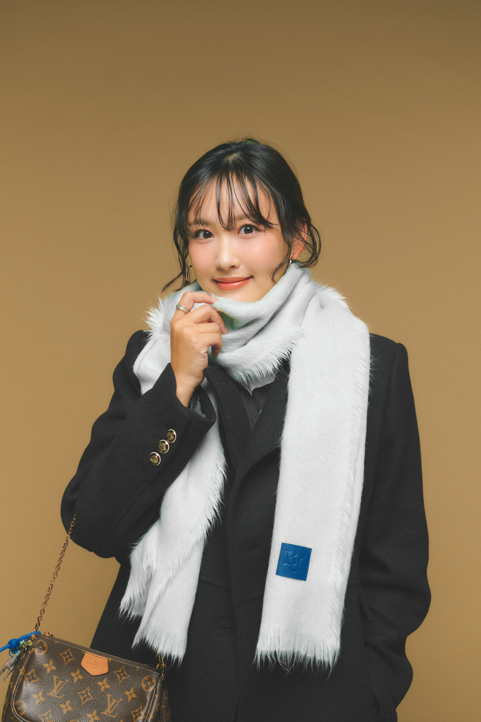 「もともとブルーが好きなのですが、今年はミントカラーにハマり中。少し甘さのある色味ですが、黒コーデと合わせるとちょうどいいバランスに。ブルー×パランのマフラーは、毛足が長くシャギー感のある素材が珍しくてお気に入り。裾の切りっぱなしのようなデザインも可愛く、さりげなく入ったブルーのロゴがアクセントになります」