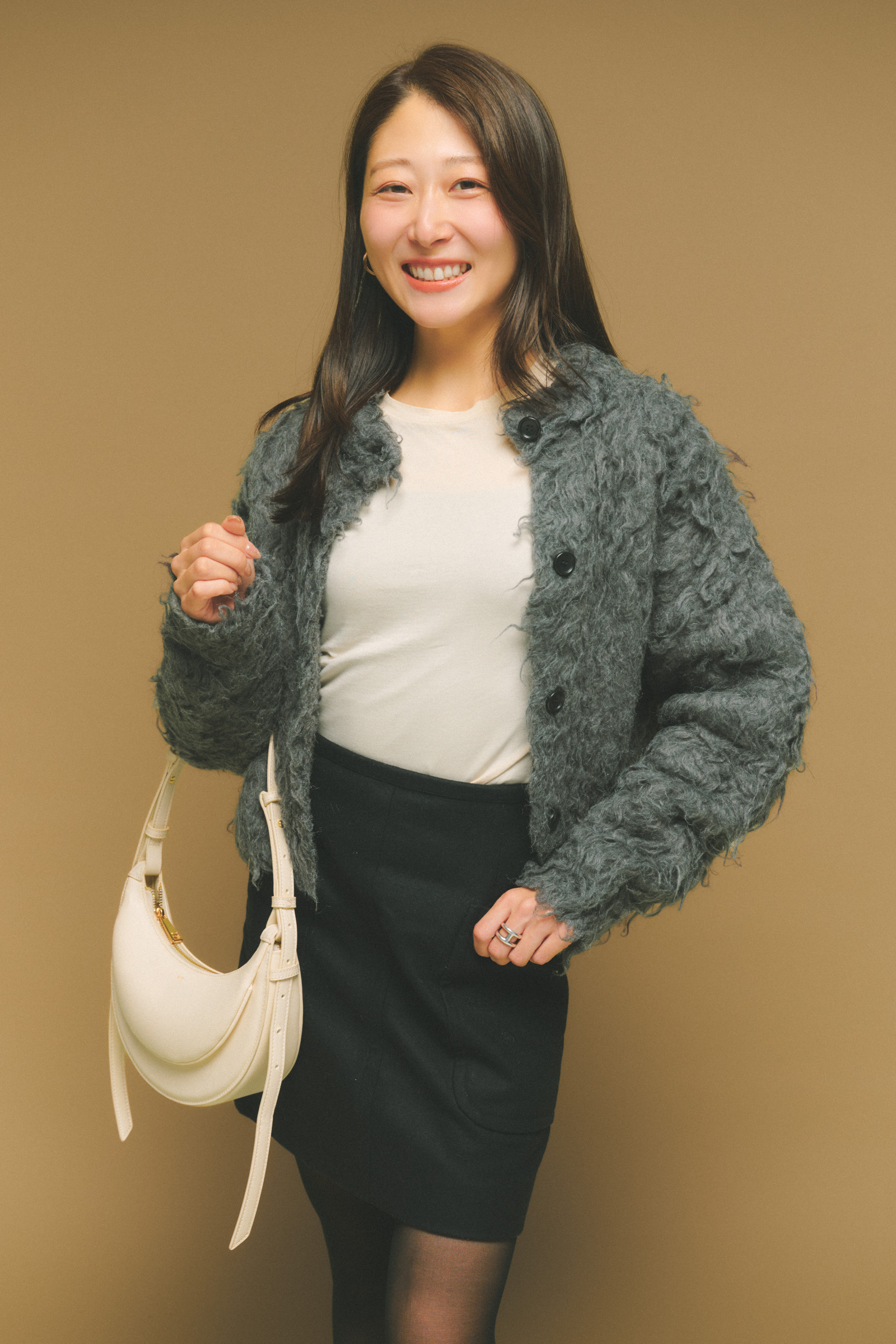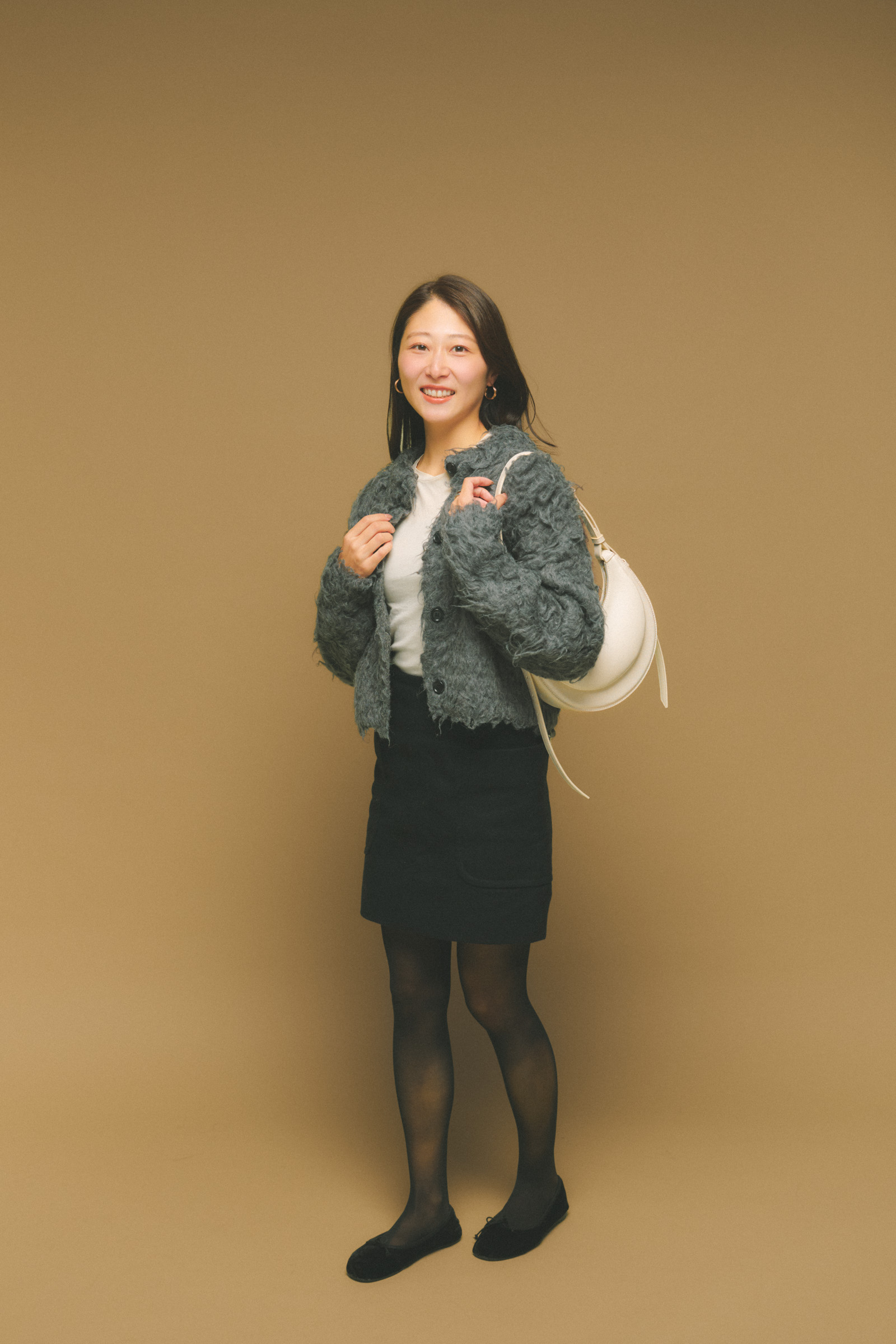「30代になってから、ミニ丈は少し挑戦しづらいと思っていましたが、トレンドもあってチャレンジしたい気分に。クラネのシャギーカーディガンを合わせると、ボリュームのあるシルエットがミニ丈と好バランスです。ボトムスから靴まで黒でまとめれば統一感も出て、パリシックに」