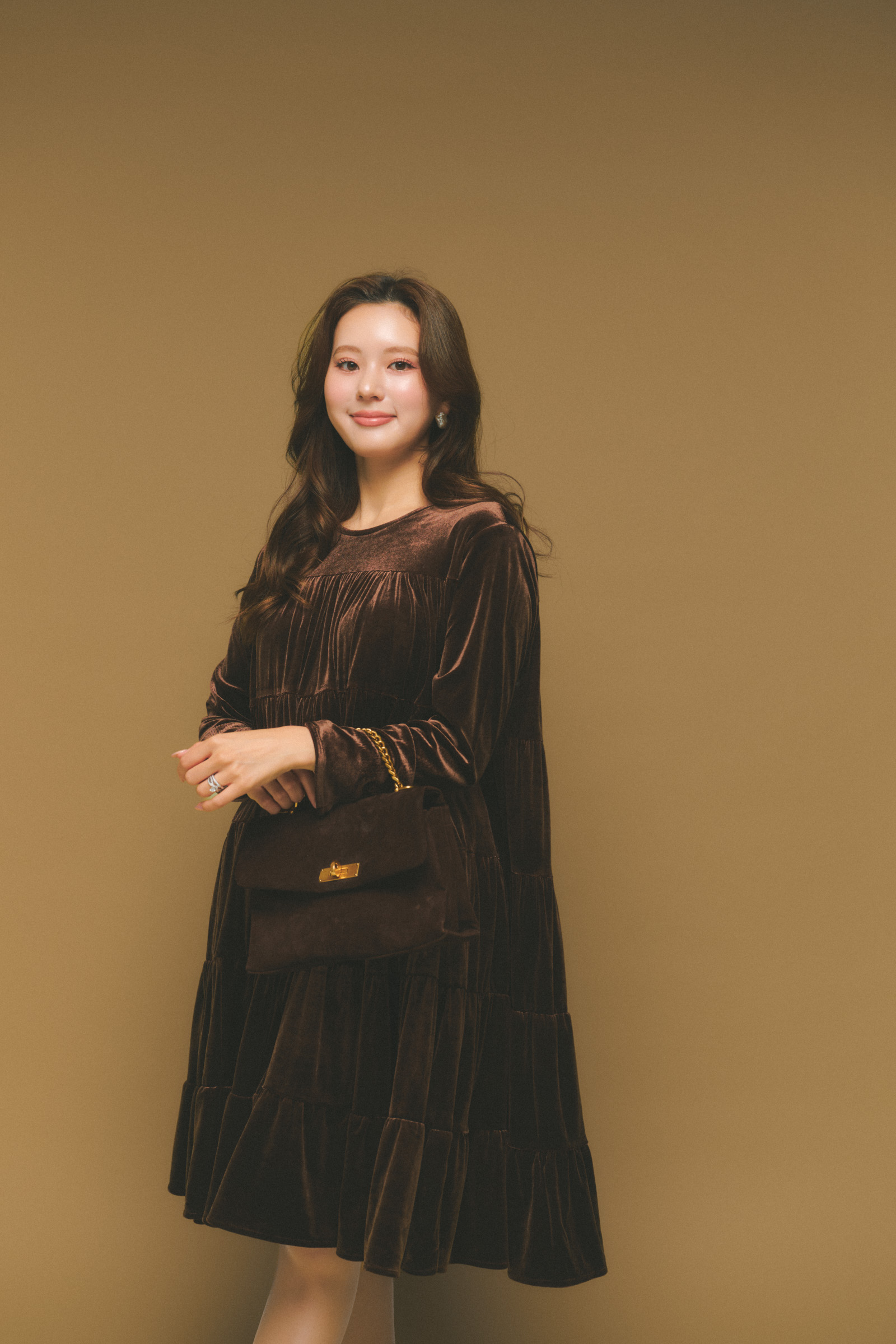 「もともとティアードワンピが大好きで、夏素材のものはたくさん持っているのですが、冬用はなかなか見つからず…。そんな時に冬でも着られるベロア素材のワンピを見つけて即決しました。手持ちは黒のベロアが多かったので、トレンド感のあるブラウンをチョイス。ティアードの裾が広がるシルエットで、ミニ丈でも脚をきれいに見せられるし、1枚でコーデが決まります」