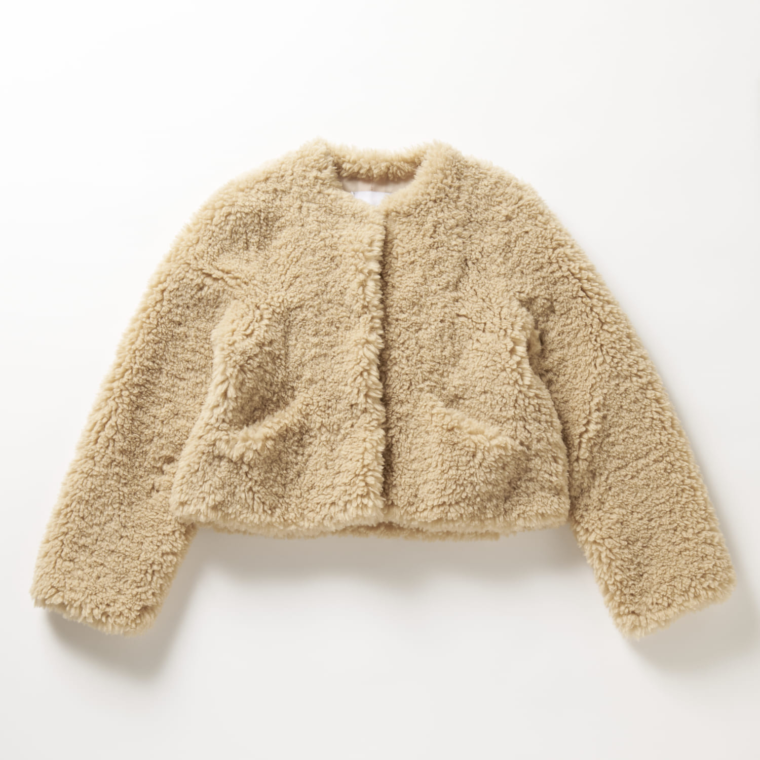 短丈アウターなのでハイウエストデニムと合わせれば、細見えスタイルアップ効果が狙えて、ノーカラーなのでタートルネックとの合わせも楽しめそう。クリーミーな色合いのフェイクファーが可愛らしいデザイン。ノーカラーファージャケット¥46,200(ハブレス/ジャック・オブ・オール・トレーズ プレスルーム)