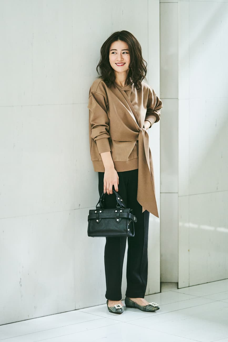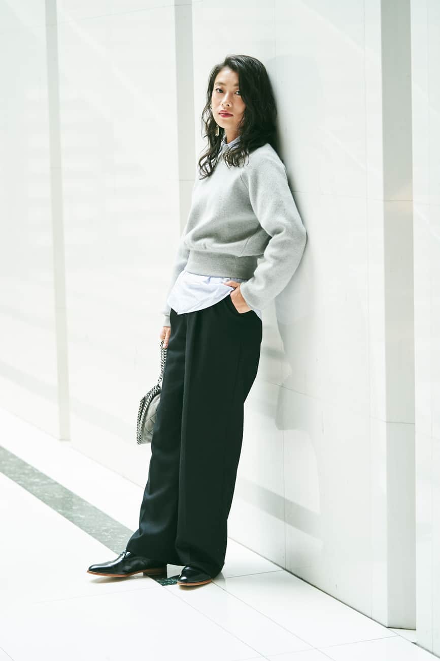「スウェットのような見た目のニットは、着丈が短めなので脚長効果があります。足元がフラットシューズでもスタイルがよく見えるのが理想です」