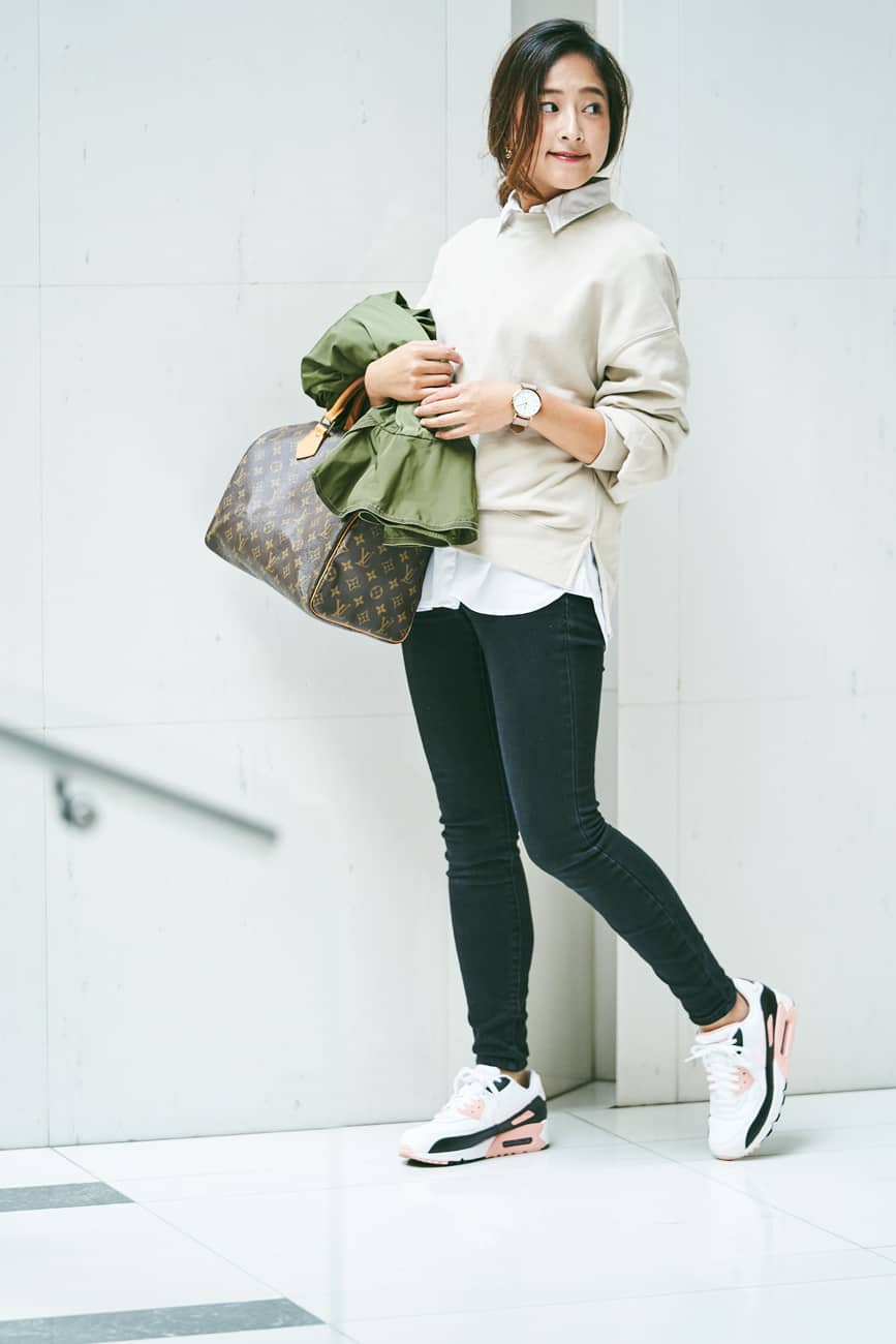 スウェット:PLST シャツ:Mila Owen 手に持ったアウター:Moncler パンツ:Anthropologie バッグ:Louis Vuitton スニーカー:NIKE