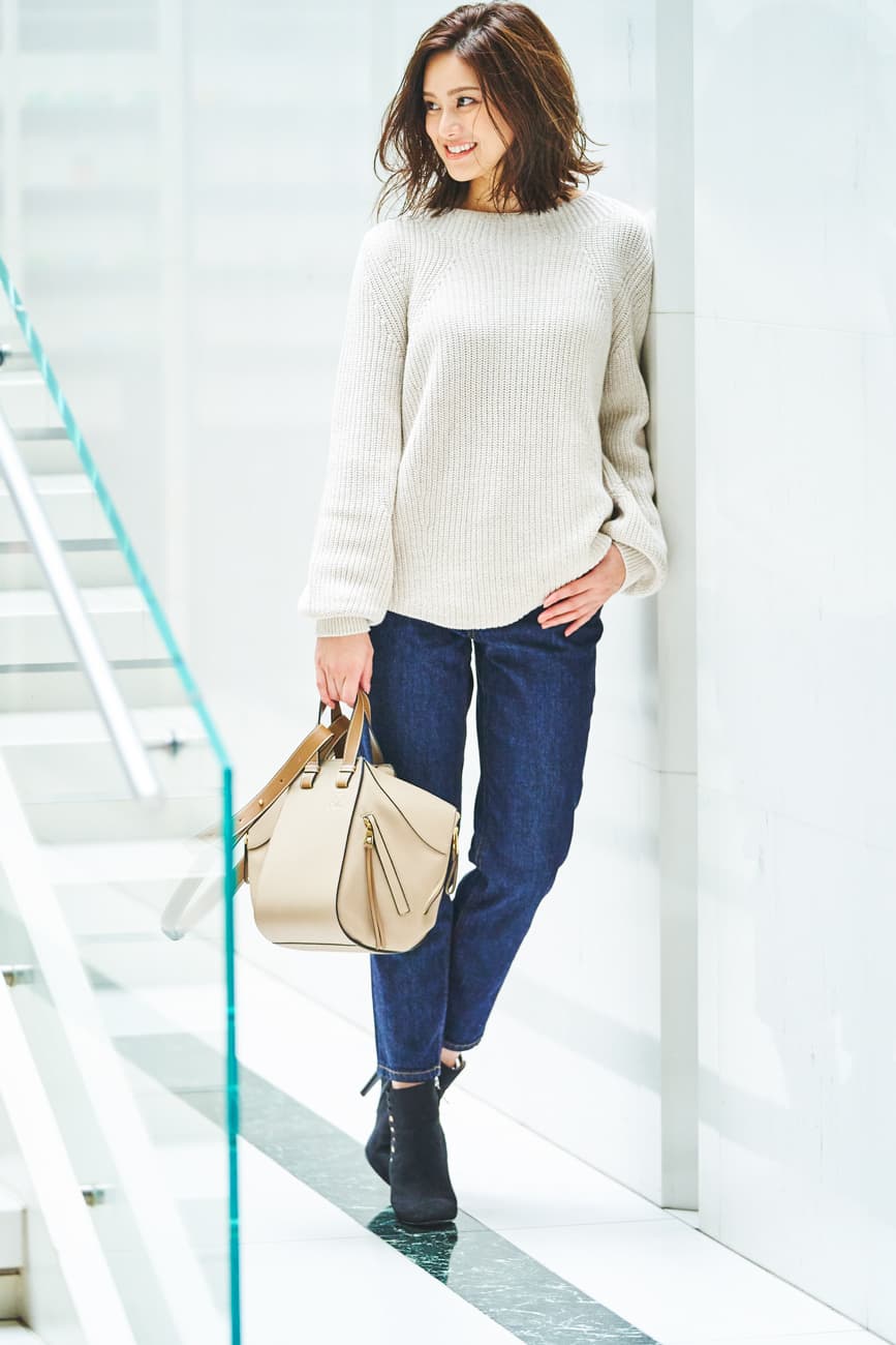 「身幅も袖も少しゆるっとしたサイズ感で、リラックス感のあるニットがお気に入り。着痩せを意識して、細身のデニムと合わせて逆三角形のシルエットを作りました」(井上友美さん 外資系金融関係勤務・30歳 162㎝)