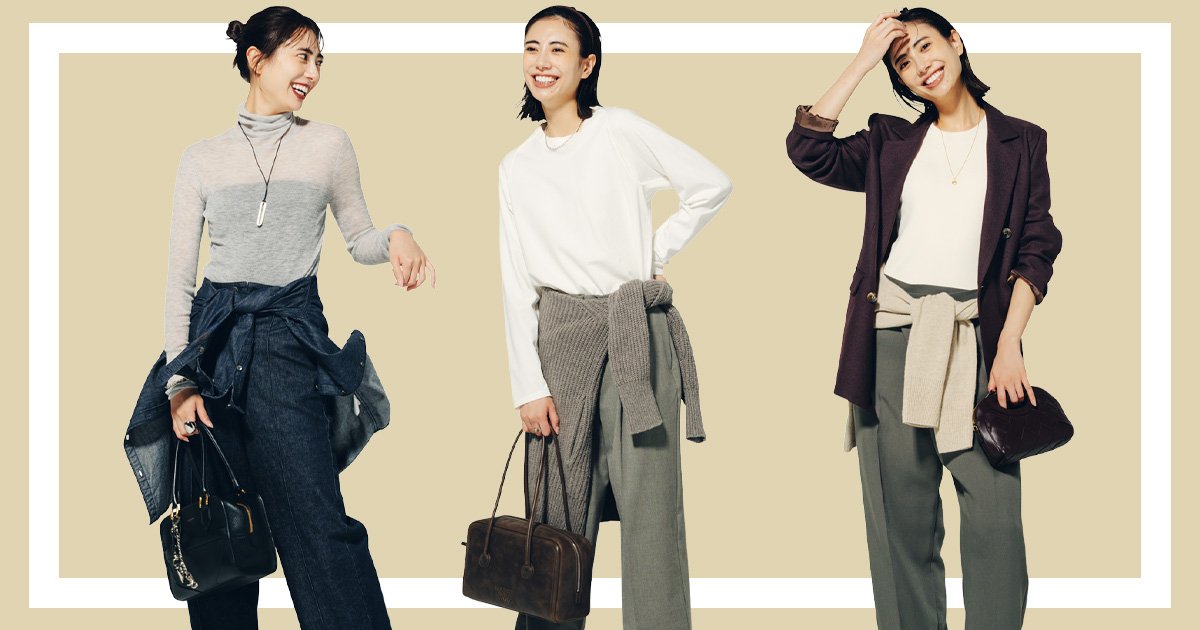 ニットの腰巻きは厚手のものを選んでウエスト回りにボリュームを出すと、単調にならずあか抜ける!厚手カーディガン¥27,500(アンクレイヴ╱オンワード樫山)パンツ[ベルト付き]¥7,990(ザラ╱ザラ カスタマーサービス)Tシャツ¥17,600(ティッカ)バッグ¥89,100(マージシャーウッド╱シップス インフォメーションセンター)パンプス¥81,400(ネブローニ)カチューシャ¥19,800(アレクサンドル ドゥ パリ╱アレクサンドル ドゥ パリ GINZA SIX店)ネックレス¥33,000(ミチ ウィルウェイ╱フォーティーン ショールーム)リング¥44,000(マリハ)