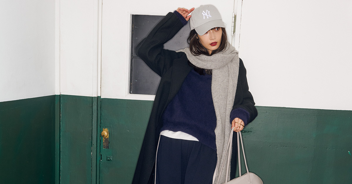コート¥110,000(カオス╱カオス丸の内)ニット¥39,600(ロンハーマン)中に着たTシャツ¥11,550(スローン╱ザ ショップ スローン 新静岡セノバ店)パンツ¥35,200(ゲミニー╱ウィム ガゼット ルミネ新宿店)バッグ(H15×W39×D13)¥19,800(アドカラム╱アンソロジー)スニーカー¥17,930(ニューバランス╱ニューバランスジャパンお客様相談室)帽子¥4,400(ʼ47)ストール¥31,900※参考価格(アルポ╱アマン)リング〈右手〉¥198,000〜(トーカティブ╱トーカティブ 表参道)リング〈左手〉¥63,800(CALLMOON╱ショールーム セッション)