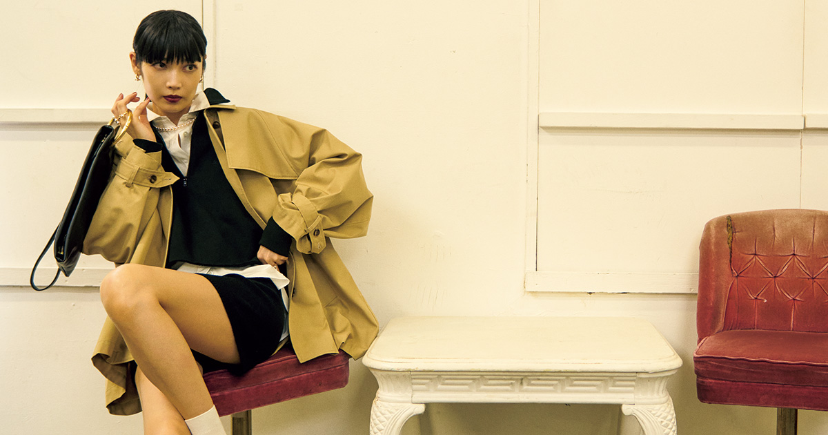 コート¥38,500(ザ ポーズ╱ウィム ガゼット ルミネ新宿店)スウェット¥27,500(THIRD MAGAZINE)中に着たシャツ¥26,400(アンタイトル)ニットパンツ¥20,900(エイチ ビューティー&ユース)バッグ¥42,900(オルセット╱TOMORROWLAND)靴下〈2点セット〉¥9,900(セオリー╱リンク・セオリー・ジャパン)靴〈H=5〉¥110,000(セルジオ ロッシ╱セルジオ ロッシ カスタマーサービス)ネックレス〈SV×あこや真珠〉¥1,016,400ピアス〈K18YG×あこや真珠〉¥882,200リング〈右手人差し指╱K18YG×あこや真珠〉¥440,000リング〈右手薬指╱K18YG×あこや真珠×DIA〉¥480,700リング〈左手中指╱K18YG×あこや真珠〉¥471,900(すべてTASAKI)