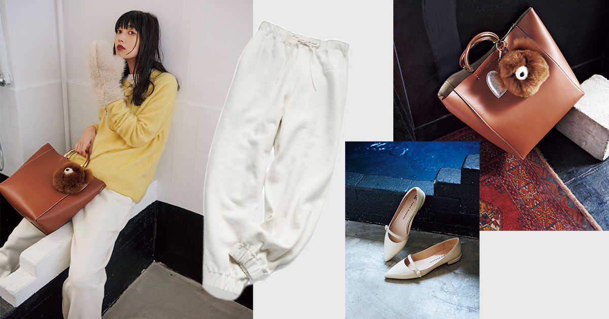 スウェットパンツにはエナメルのフラットシューズできれいめに締めて。存在感満載なモコモコチャームを連れて、愛嬌溢れるスポーティコーデに!