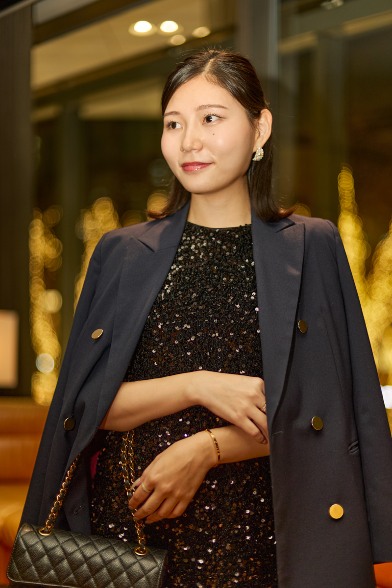 「ドレスコードの「グリッター」に沿ったキラキラアイテムとして選んだワンピースが華やかでお気に入りです。他の小物はベーシックなカラーで揃えることでバランスをとりました」