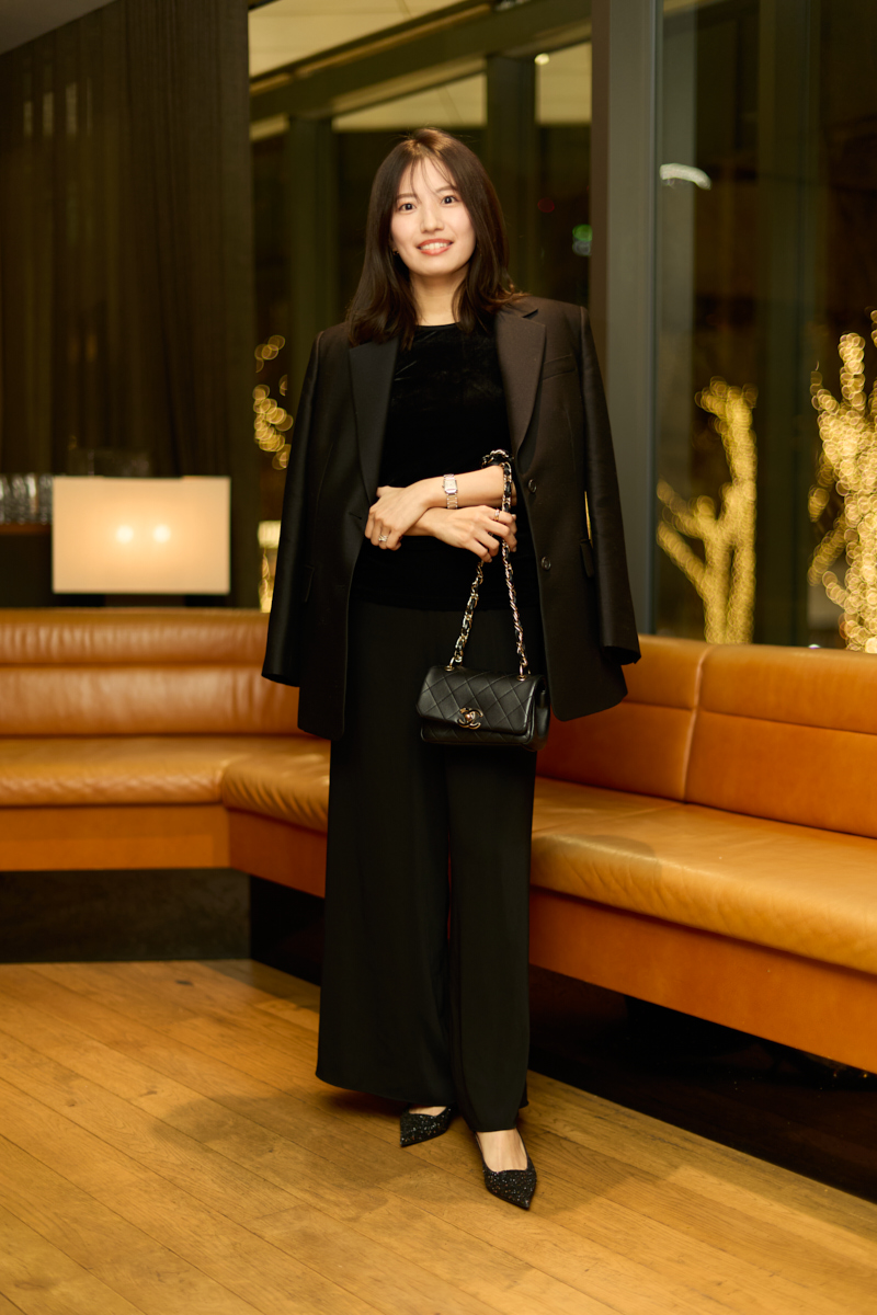「ジャケットとパンツはどちらもORR。ジャケットは肩パッド付き、パンツは太さがありますが軽くて滑らかな素材で上品にきちんと見えするところが気に入って愛用中です。普段からモノトーン多めのシンプルなスタイルが好きで、最近はダークカラーのワントーンコーデが気になります」