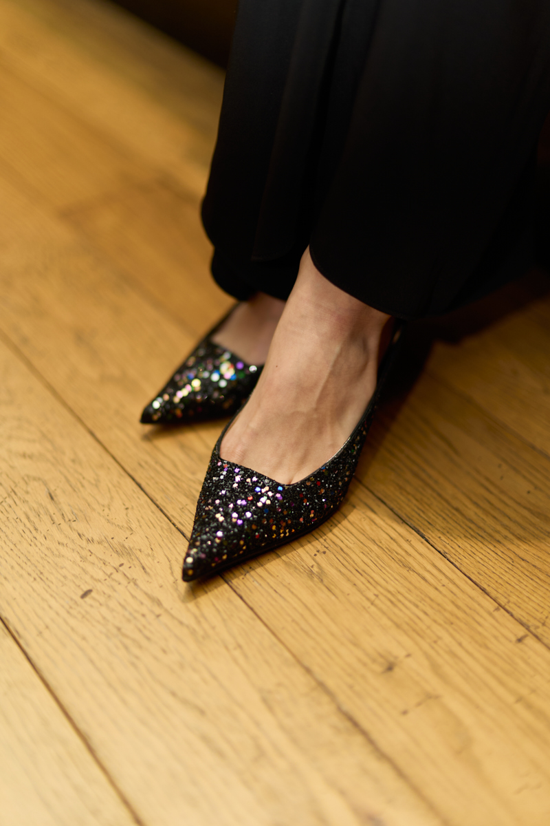 「ドレスコードのグリッターはミュールパンプスで取り入れました!その他はオールブラックで統一し、足元のグリッターが目立つように。ベロア素材のトップスで季節感を出したのもポイントです」
