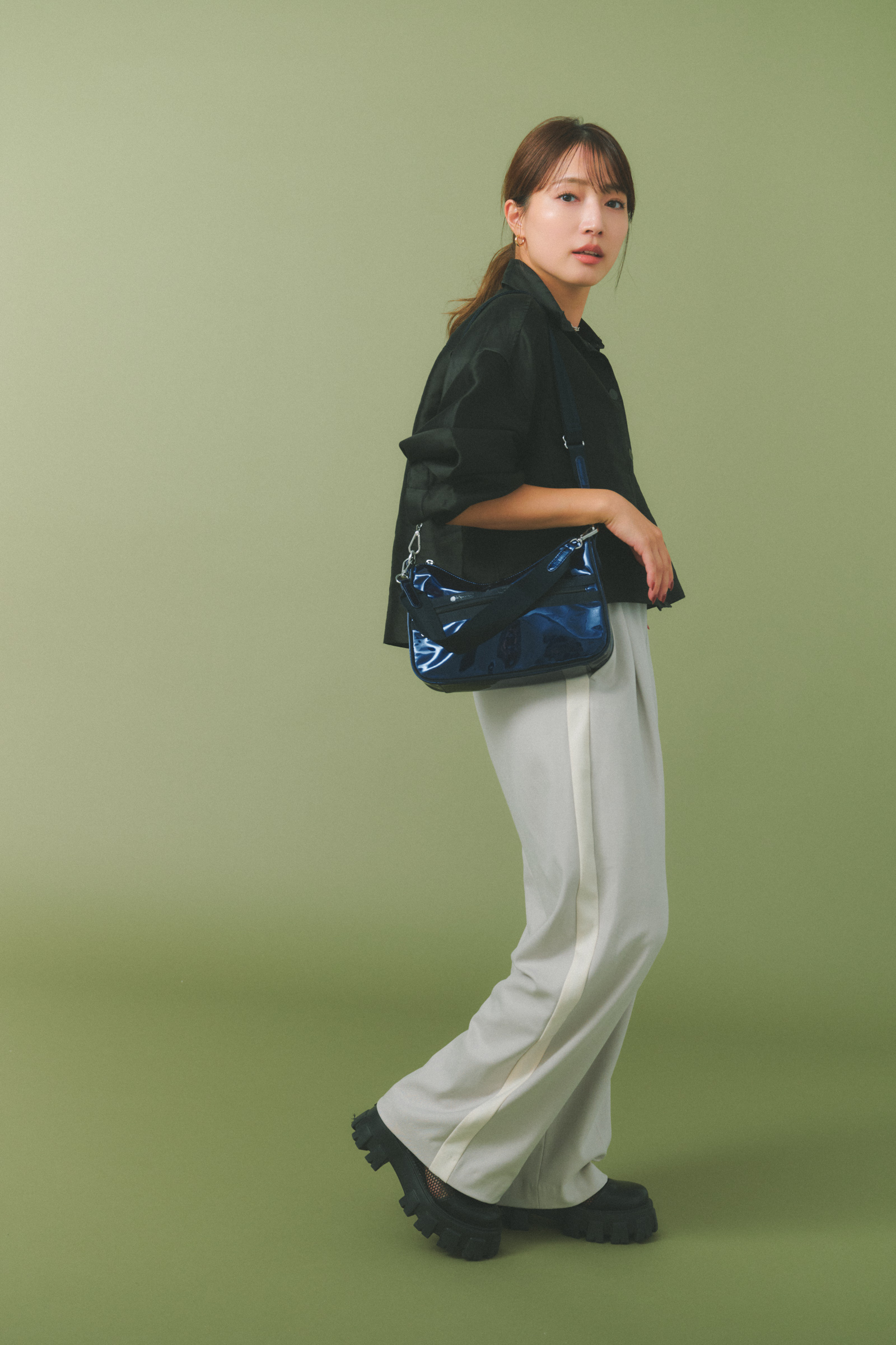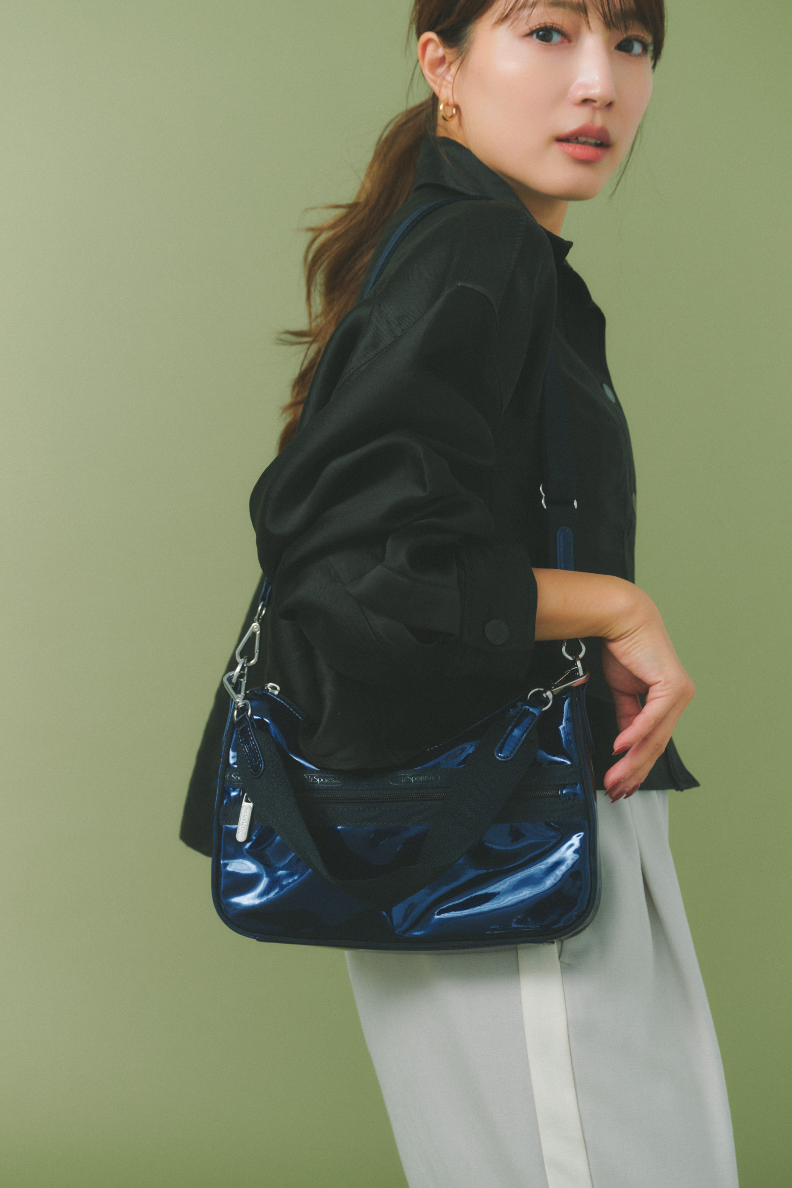 「レスポートサックのボディバッグは、メタリックが効いてるからカジュアルでもほっこりしないところが好き。エッジが効いているので、コーデのアクセントになります。軽いし気兼ねなく使えるので、旅行の時には必ず持っていきます」