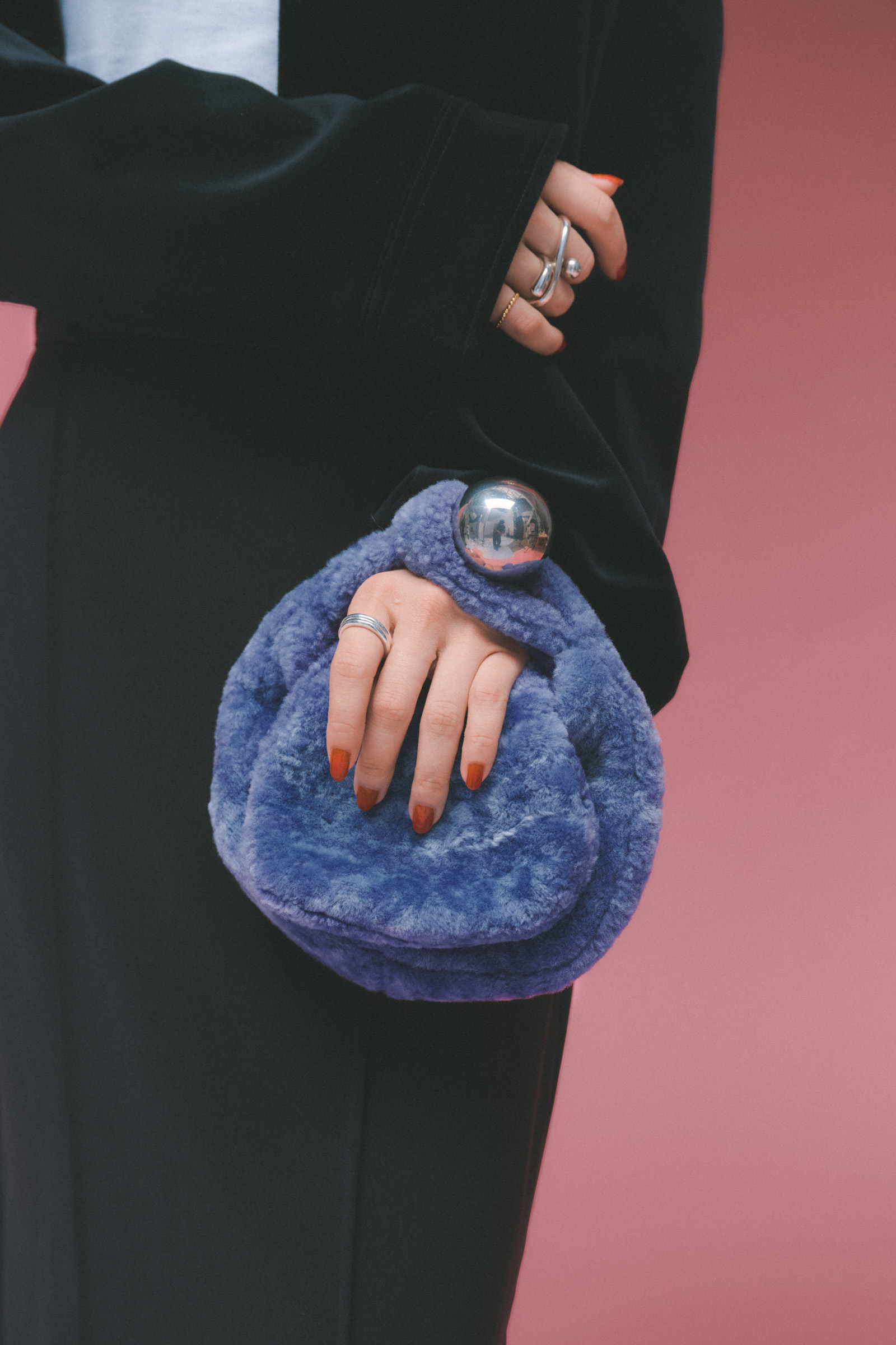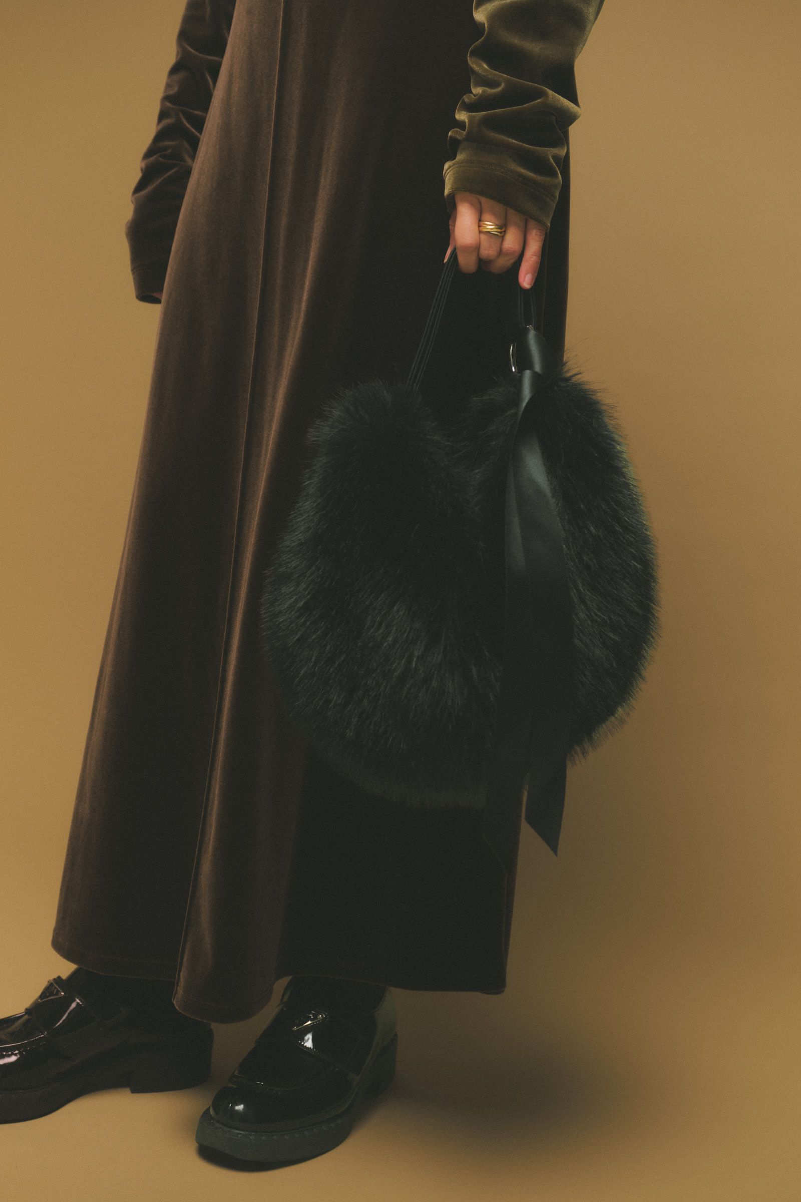 「シャポードオーのファーバッグは、直毛気味のファーの質感がアクセントになって、華やかさをプラスしてくれます。甘く見えがちな素材ですが、ワンハンドルのすっきりしたデザインとレザー調の持ち手で、大人っぽくサマになります。巾着型でラフに持てるので、キレイめな着こなしのハズしとして愛用しています」